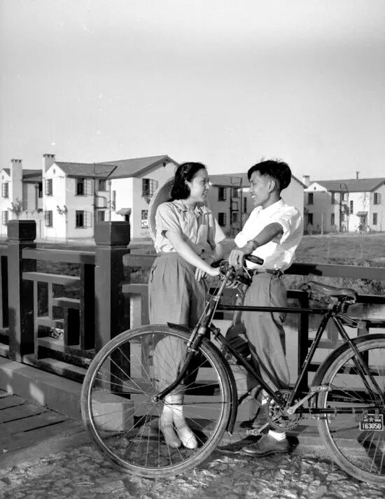 纱厂女工孔阿菊和其丈夫徐真华站在曹杨新村“红桥”上