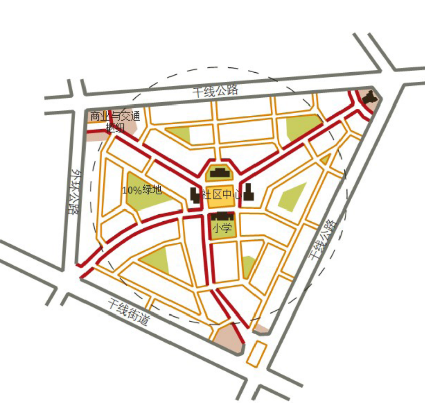 新村的商业文化中心集中布置在主要道路交叉处;中小学、幼儿园和托儿所则平均分布在新村的独立街坊内,不妨碍居住的安宁。每个邻里配置本地自有的社区设施,如医院、公园、学校、邮局、电影院等,保证这些设施都坐落在邻里中心步行范围内,居民步行只需10分钟左右,就可到达新村中心,非常便利。