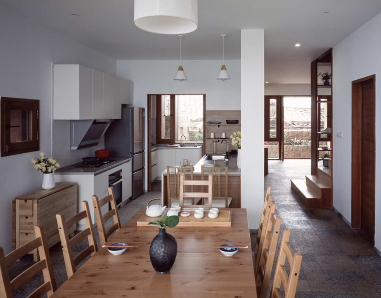 设计师将原来的门槛通过局部抬高地面标高,既保存了原有石头门槛,又统一了地面标高,方便图书馆等大空间的使用要求。屋内的土灶有三个被完整保留并连锅盖一同刷成白色,将原本不起眼的日常用具改造成艺术装置。