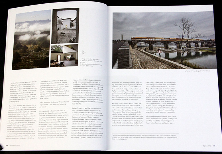 中国馆所展览的建筑作品被收录于《建筑中国——建设未来的乡村》杂志中,该杂志的使命是传播当代中国建筑的创造性作品,并深化对中国建筑传统和趋势的欣赏。