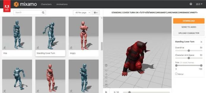 通过Mixamo软件进行简易的绑定,并为其重新添加自带的动画姿势。