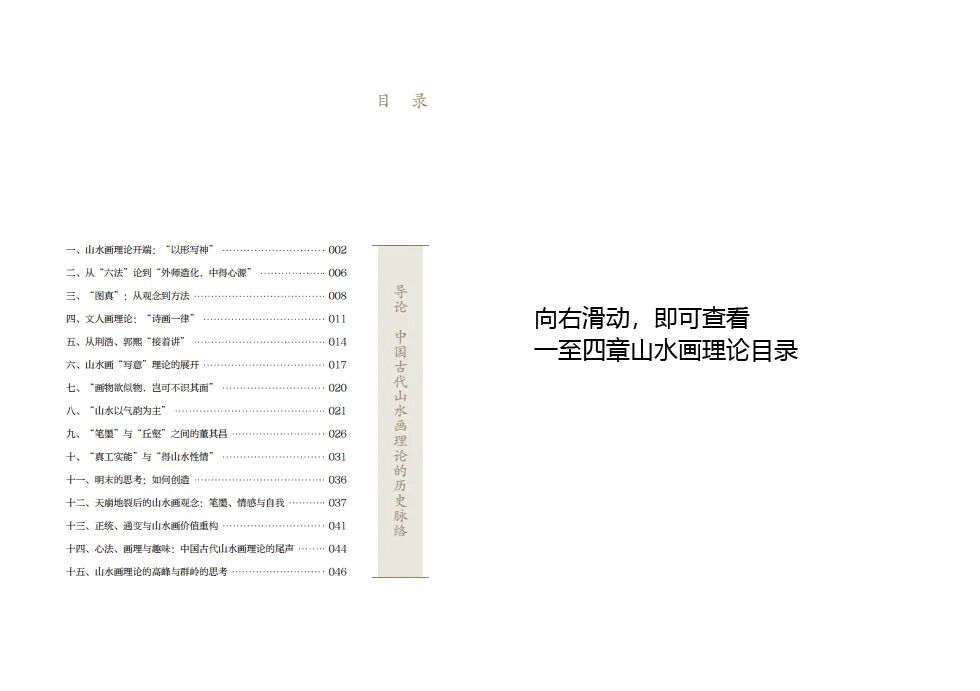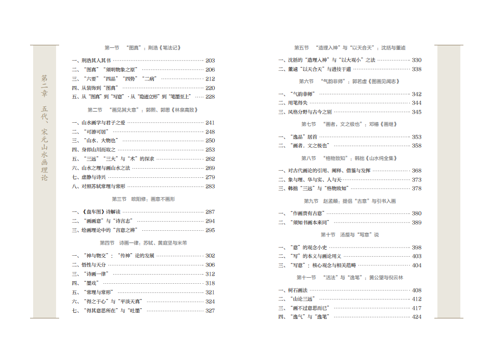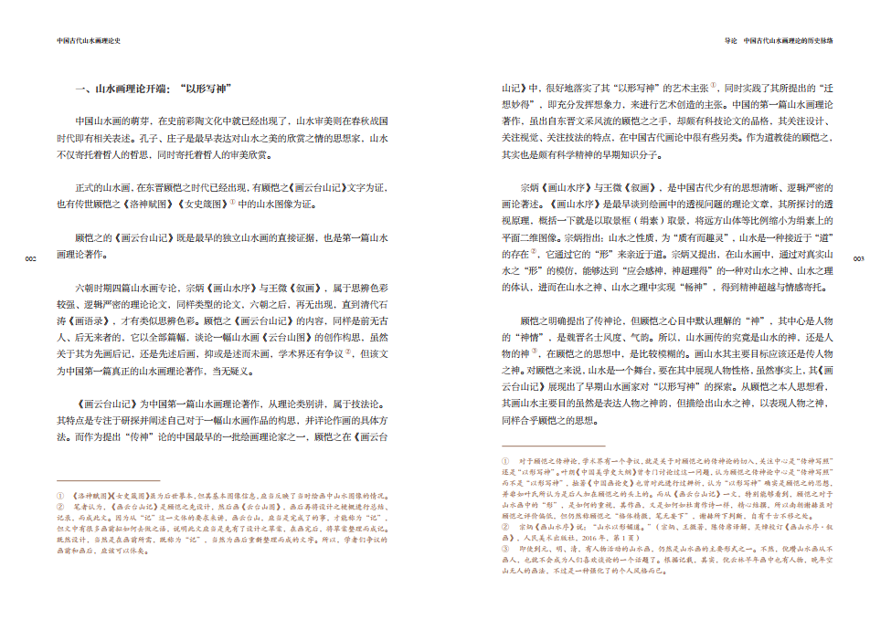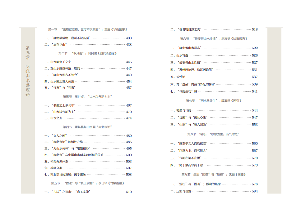 全书共由五个部分组成,分别是导论和四章山水画理论。作者按照朝代顺序将中国古代的山水画理论分为四个阶段,分别是六朝至唐代、五代宋元、明代、清代。如在“六朝至唐代山水画理论”中,作者阐述了顾恺之《画云台山记》、宗炳《画山水序》、王微《叙画》、谢赫《古画品录》、梁元帝《山水松石格》、王维《山水论》等名家山水画理论,每一章节都将该阶段最具代表性的山水画理论深入剖析,阐述其发展脉络与理论根源,运用独到的艺术史眼光展现各个朝代的山水画观念,具有重要的学术价值。