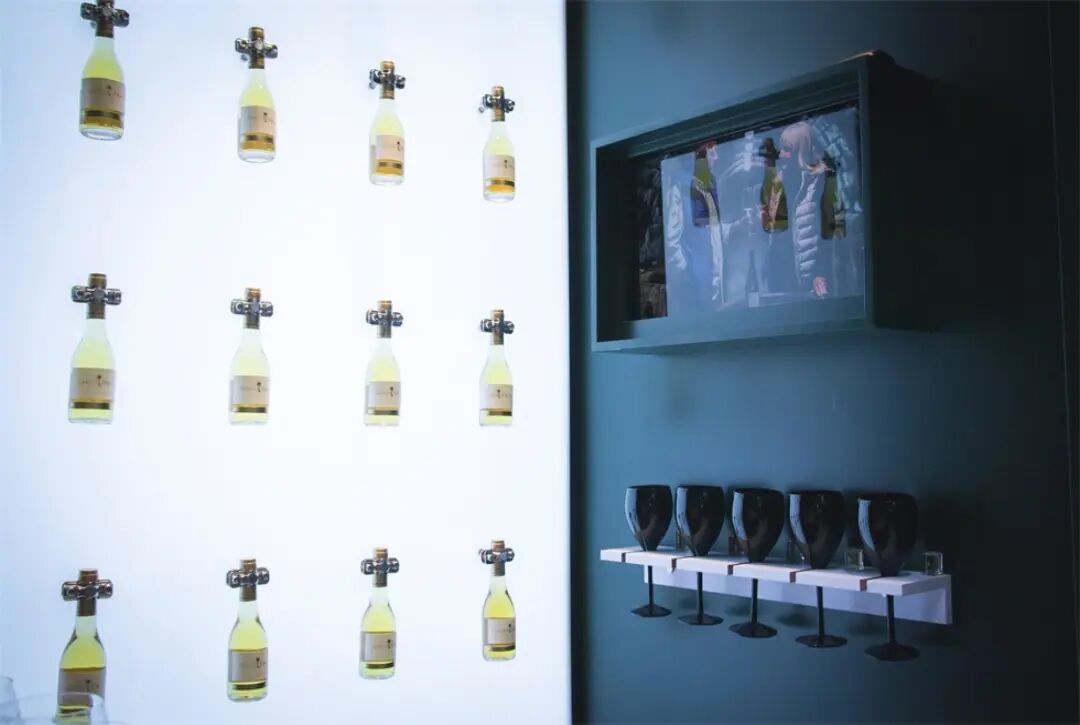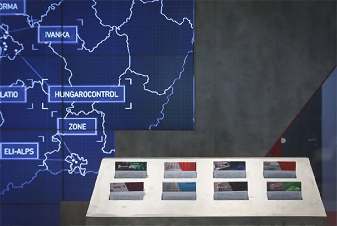 在展区中心的柜台上,有参展商公司的信息卡供参观者领取。如果有人把这些卡片放在柜台上,就会激活墙上和地板上的全景显示器上的视频动画: