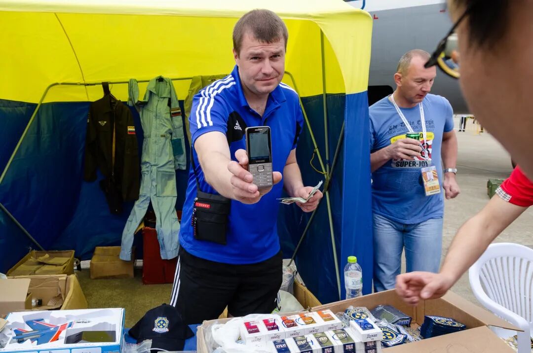 第九届中国航展上俄罗斯飞行表演队的成员在售卖纪念品,广东珠海,2012年 高瀚 摄