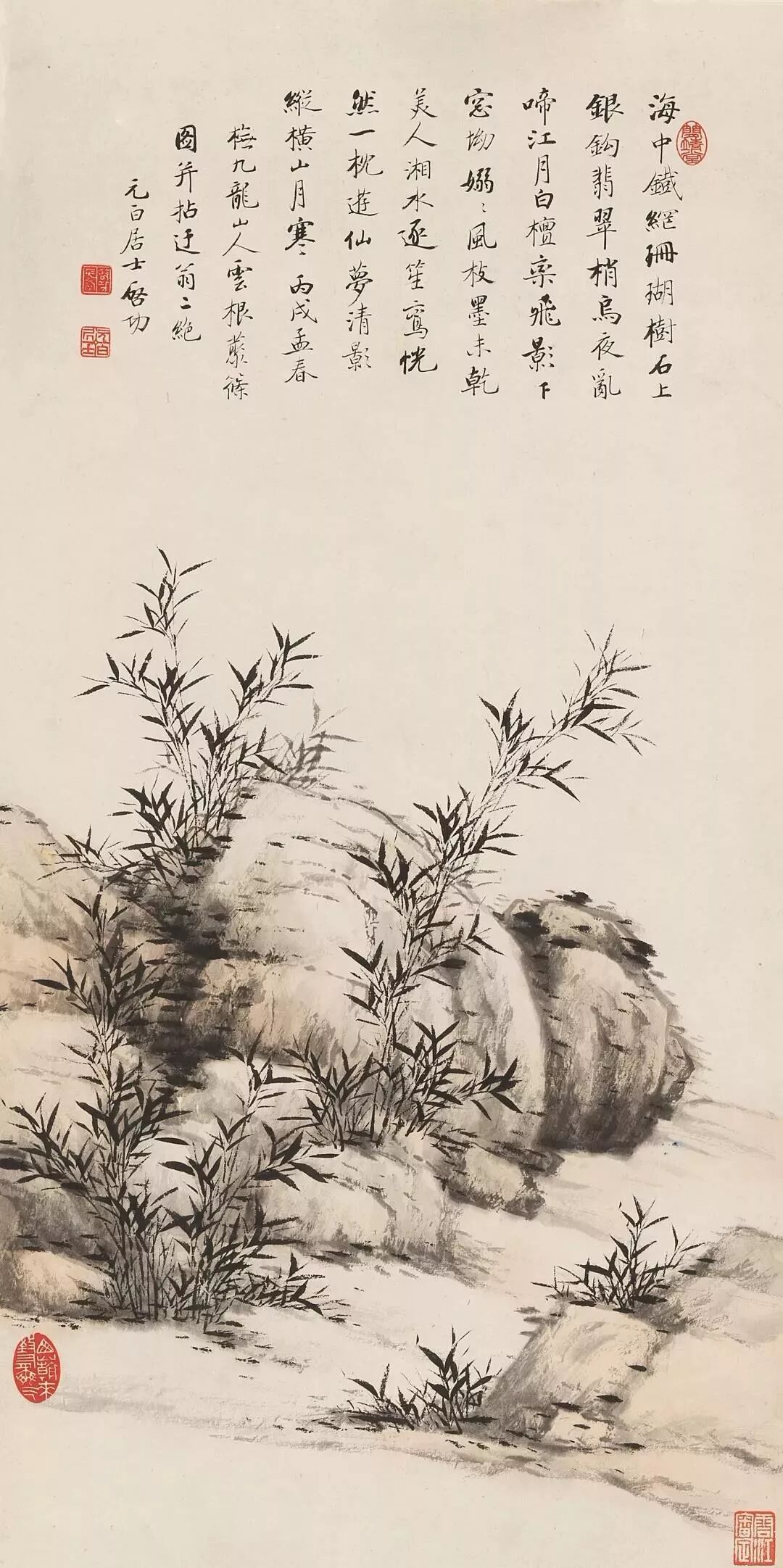 其三,从中国画的元素组成来看,中国画由诗、书、画、印等几个方面组成。“诗”并非一定要在画面上题上诗句,“书”也不一定要在画面上写上书法,而是指画面造景要有诗意,要崇高,美妙动人。而物景造型则要求是书法的笔法,要求变化无穷,而又恰到好处、浑然天成;“画”是画面形体,要求在似与不似之间;“印”也非独立于落款,而是在于均衡,补白,添彩而用,更要“印”的大小,形状,刀刻风范同画家气质,画面风貌吻配天成。这些说明中国画要求有很高的综合能力,单一的绘画造型能力只是其最基本的功力,而更多的是绘画造型以外的东西。自古以来,也有许多精于造型的绘画,但都被称之为“匠”,真正的中国画必须有书法、文学、哲学、伦理学以及自然、社会等众多综合功力。