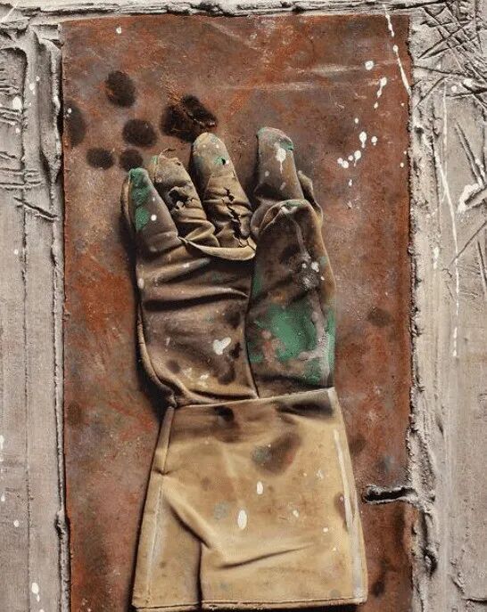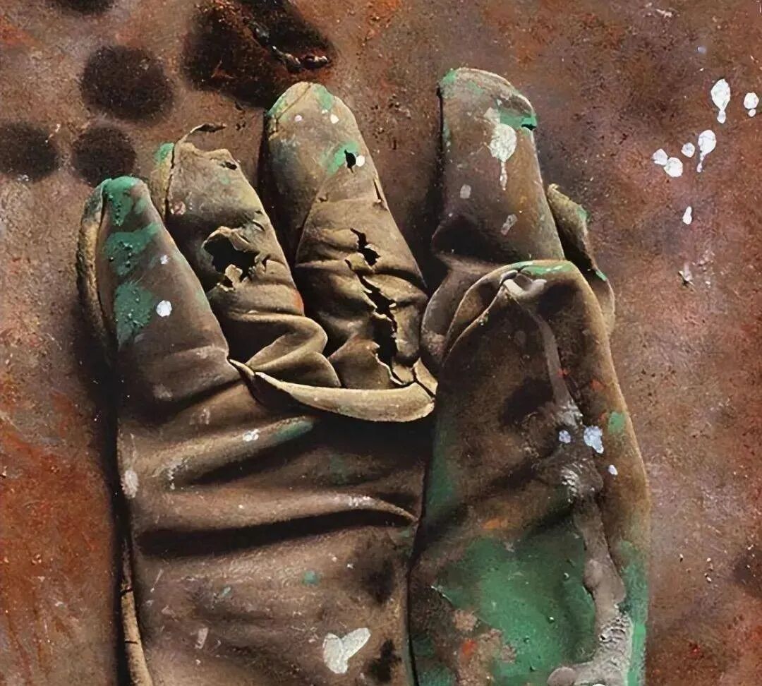 从破旧手套中可以看出工人的命运,也寓意工人的工作不易,破旧手套没有感情,可冷军的画却带有感情。