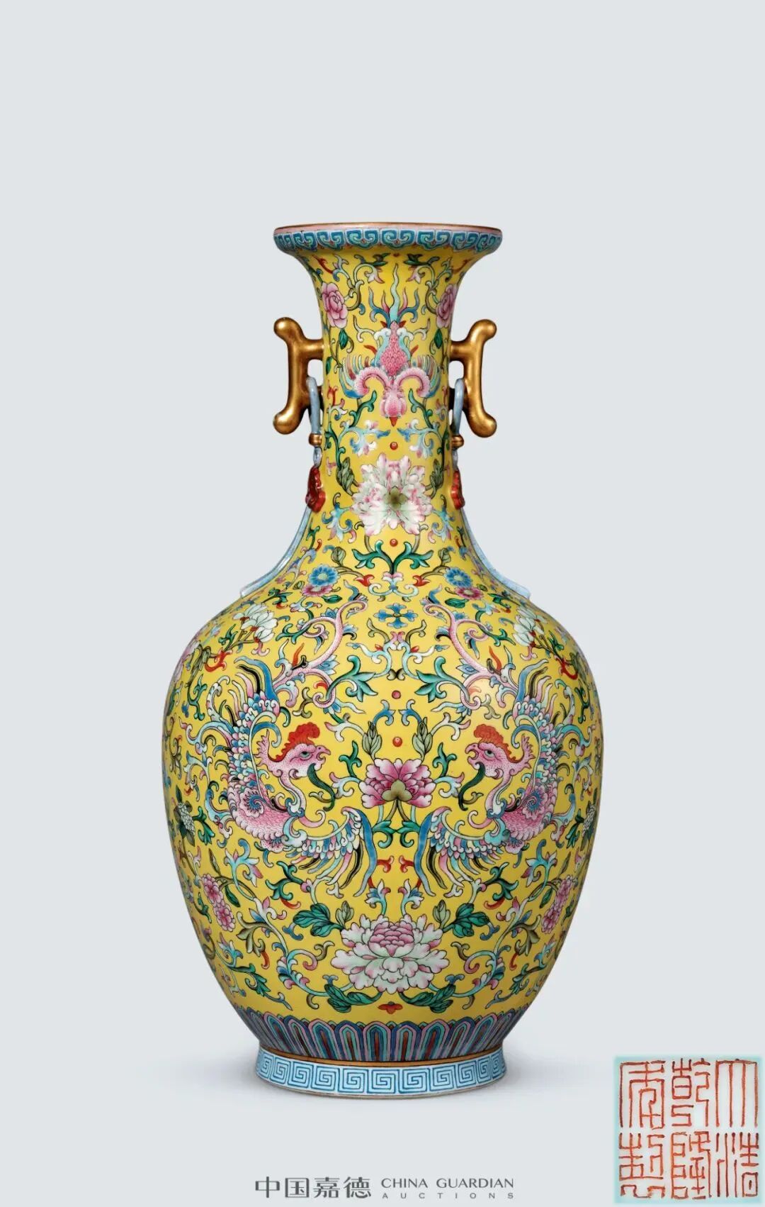 清乾隆 黄地洋彩穿花夔凤纹吉庆升平耳瓶