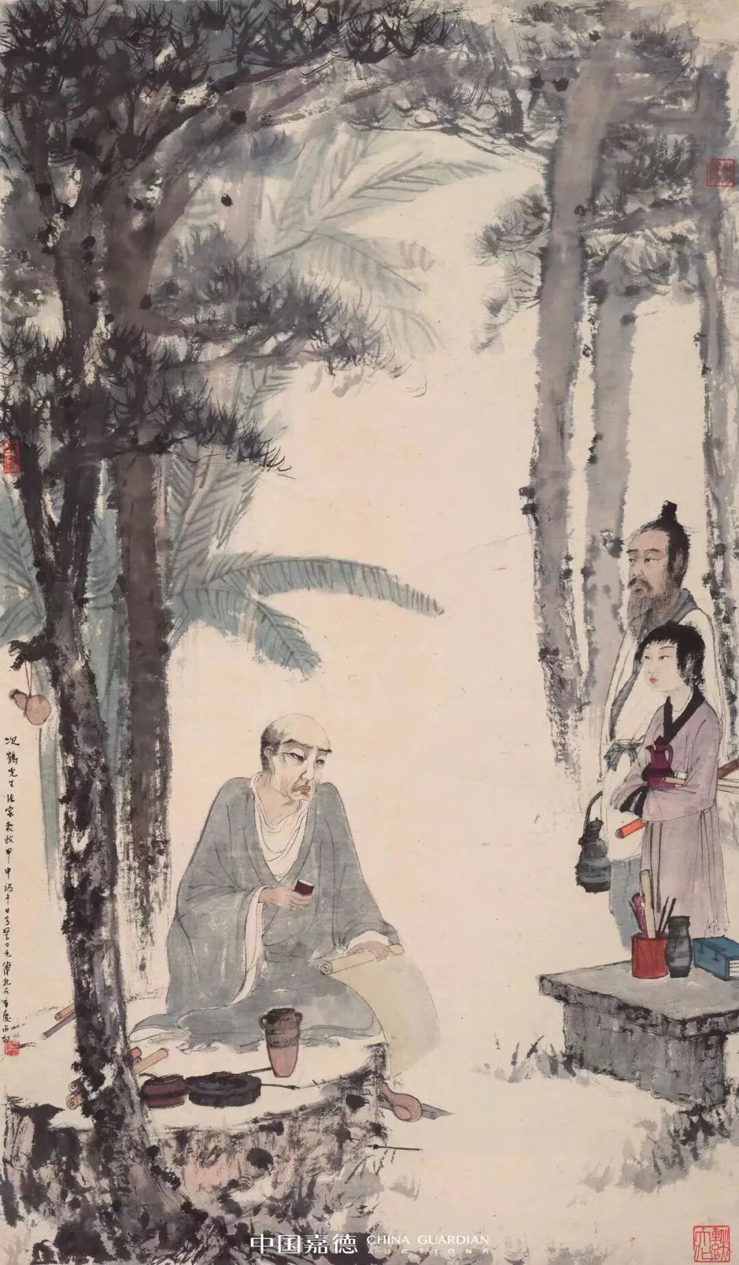 此番由齐白石《嘉耦图》和张大千《拟周文矩戏婴图》领衔“大观”之夜。“南张北齐”两件至精之作分别代表了齐白石晚年之光辉烂漫纵横捭阖与张大千盛年工笔婴戏之华贵精丽,两幅赫赫名迹均是珍藏多年,此番聚首熠熠生辉。傅抱石《醉僧图》清癯苍古,画赠金融家丁次鹤,1996年自嘉德释出,此番“回嘉”亦令人引颈以待。