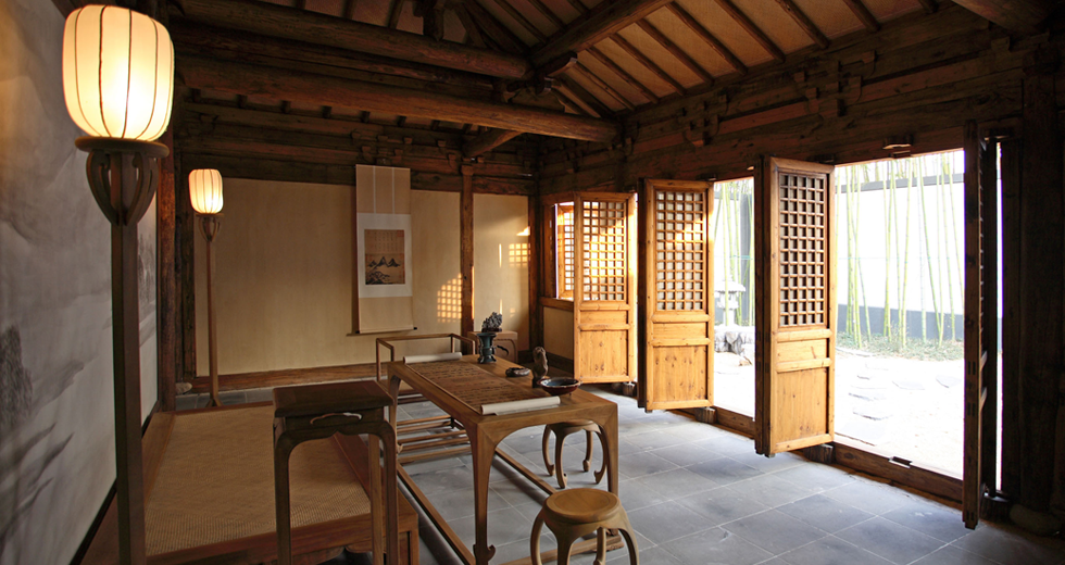 室内空间不大,却明净异常,其中几榻、琴剑、书画、鼎研之属,皆制作不俗,铺设得体。此一山斋,较之今之别墅,更具一份静谧,常只自己一人,无俗事扰心,惟与自然之物、之景共呼吸;偶有志趣相投的一二朋友来访,幕天席地,品茗论道,亦为乐事。靠近书斋处,设一斗室以作茶寮,寒宵兀坐,或供长日清谈,实当幽人首务。