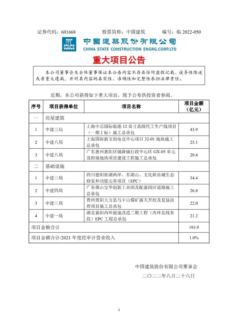 近日,中国建筑股份有限公司发布中标重大项目公告。近期,公司获得如下重大项目: