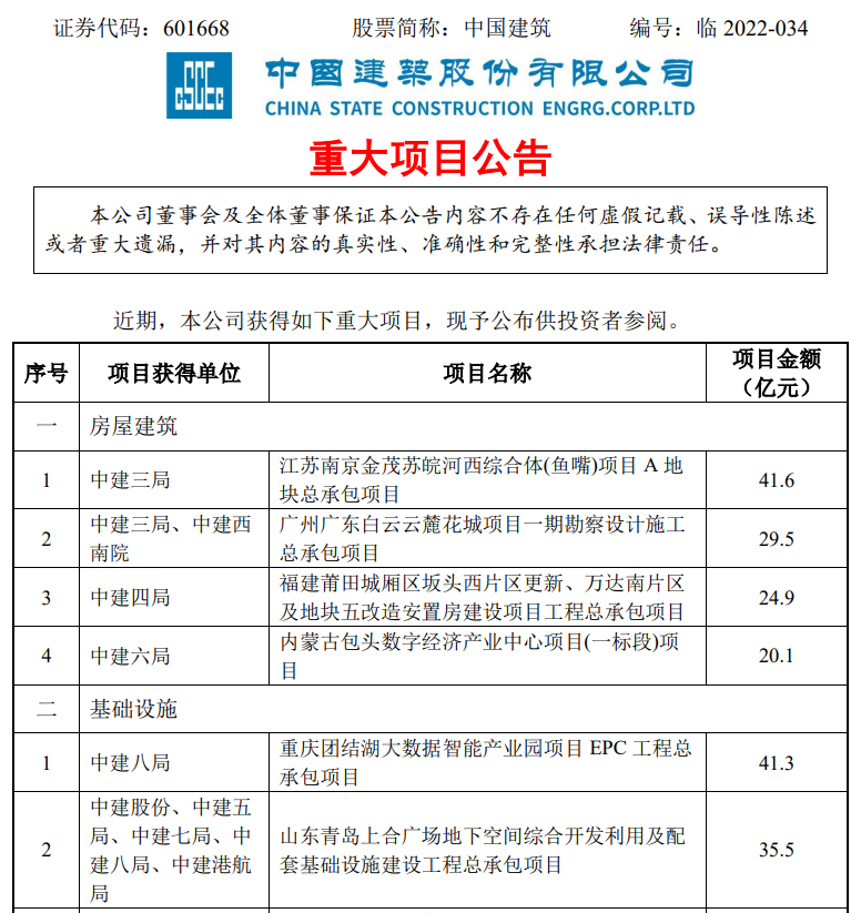 (包含与中建五局、中建七局、中建八局、中建港航局联合中标)