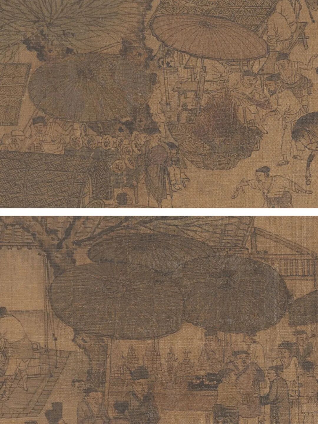 除了上面这位外,《清明上河图》里,光是汴京这一条长街上,就有几十个撑伞做买卖的沿街商人。