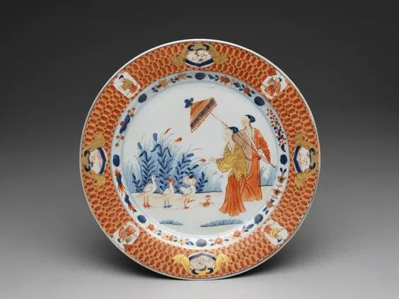 清乾隆 五彩持伞美人纹盘