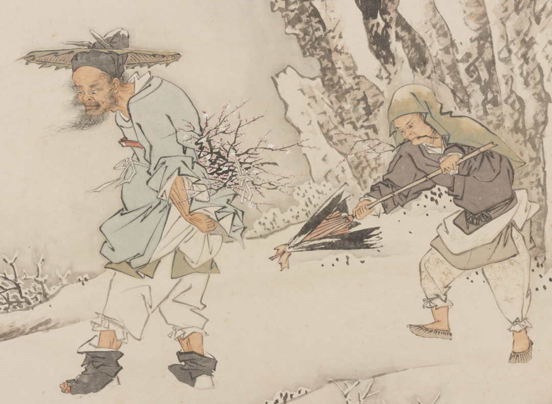 画卷中策杖撑伞的主人公踏雪寻梅,身后两侍童抱琴相随,全然不顾风雪严寒,只为一雅趣,让人不由想到张岱的《湖心亭看雪》:“莫说相公痴,更有痴似相公者!”