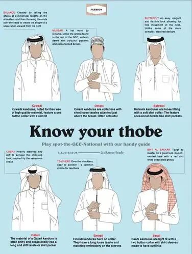 阿曼最为独特,用帽子(马萨帽)或缠头代替头巾,马萨帽的颜色还有等级之分——
