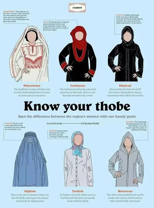 沙特妇女的黑袍是一件宽大的黑斗篷、利比亚妇女外出时常使用一块类似披风的布,把全身裹紧只露出双眼或一只眼睛……