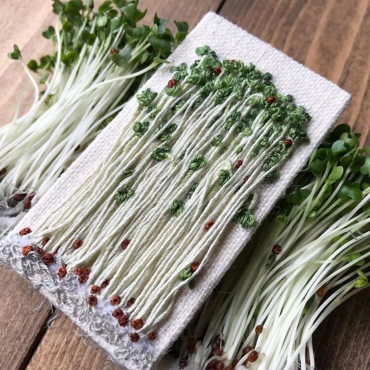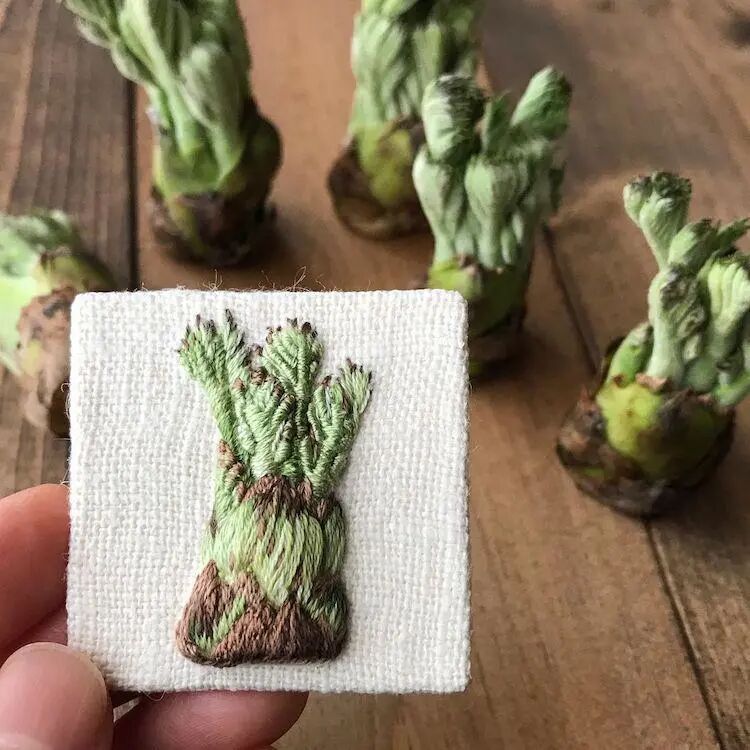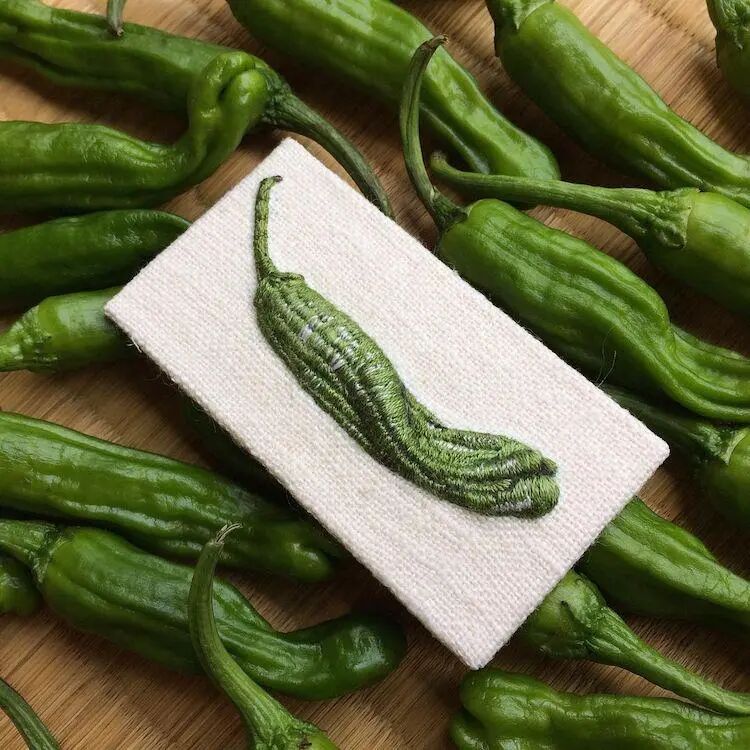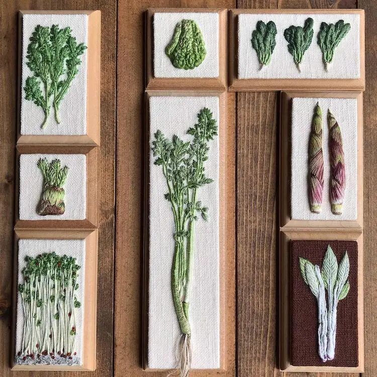 这位来自日本的艺术家给自己取名为“连接”,以富有创意的刺绣作品被人熟知,前文中说到的种菜爱好,自然也是用刺绣的形式,绣出各种蔬菜的模样。因为刺绣的作品十分精致且逼真,所以被人戏称为在布面上“种菜”。