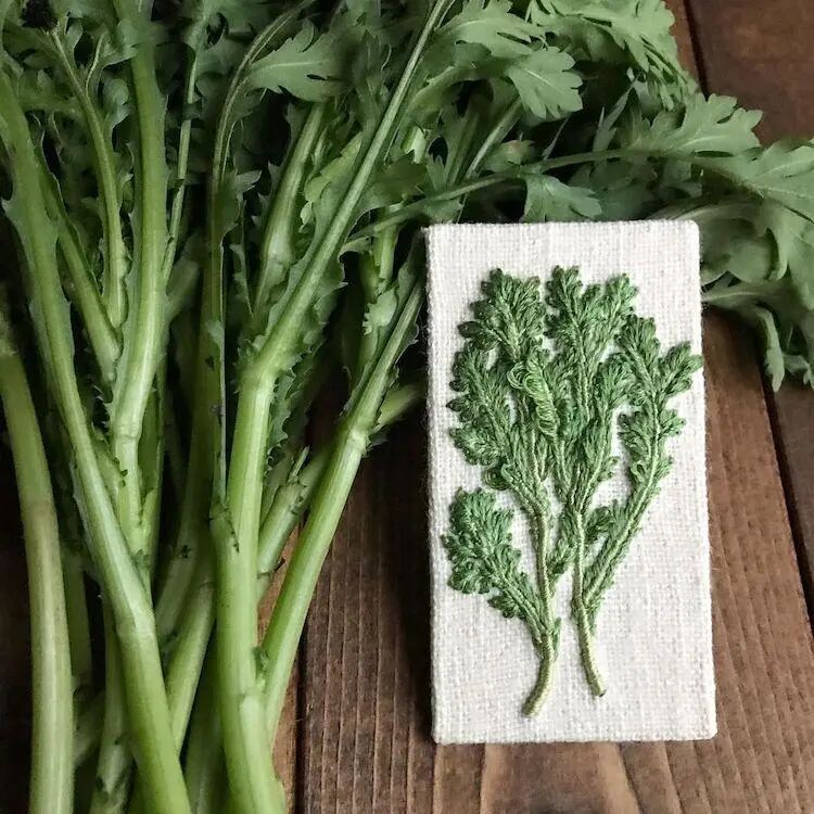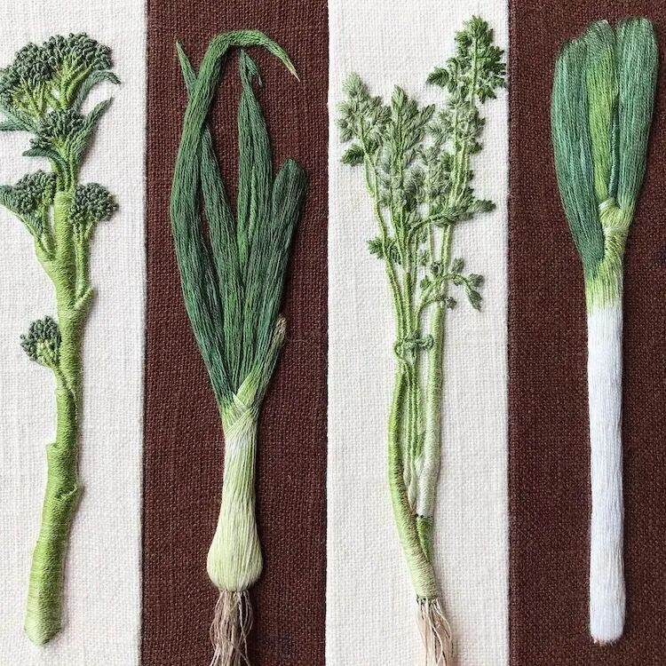 这位刺绣艺术家的作品有很多,大多都是我们常见的蔬菜,其中有:胡萝卜、白菜、辣椒、大葱和菜花,这些琳琅面目的刺绣蔬菜,足够10多个人大吃一顿。每一幅刺绣都是以真实的蔬菜为原型进行创作,因此,我们可以看到卷曲发黄的菜叶,以及刚刚出土嫩红的菜根,仿佛这些刺绣作品并不是由线组成,而是真实的蔬菜一样。