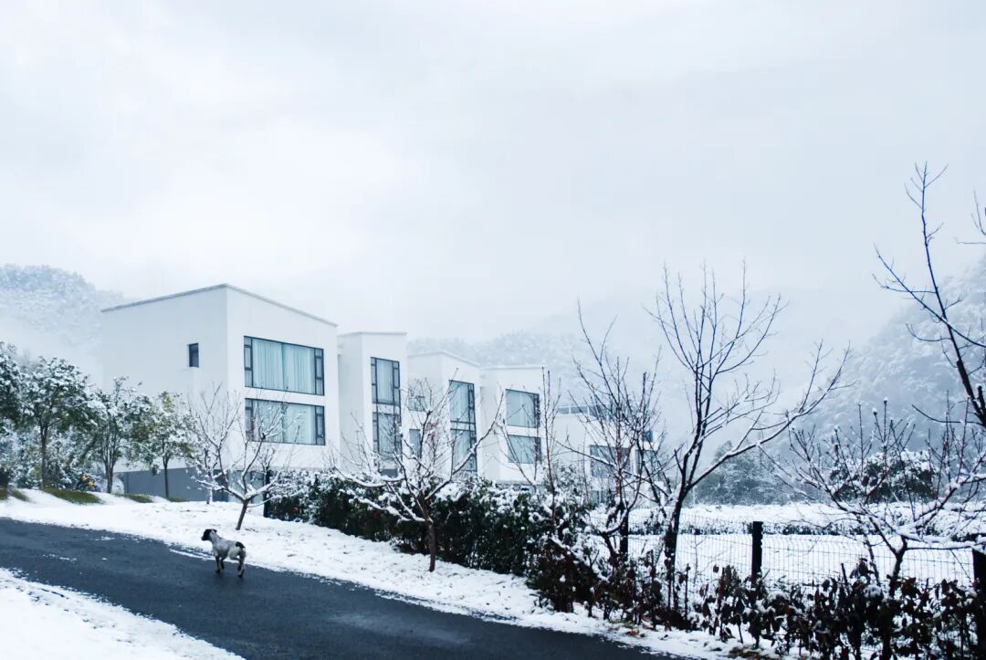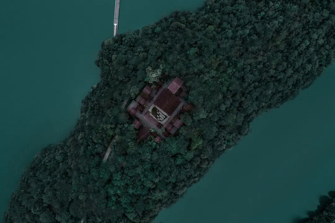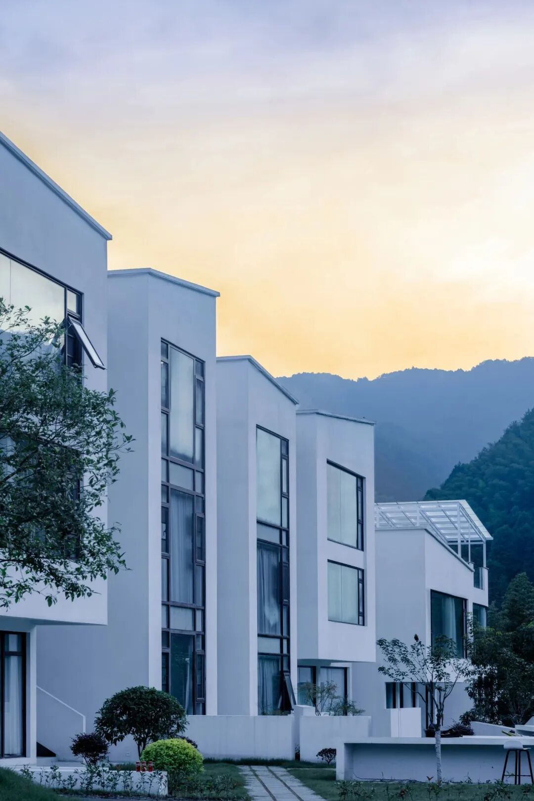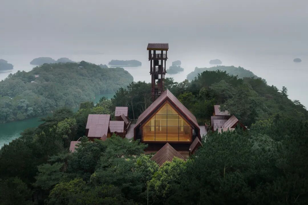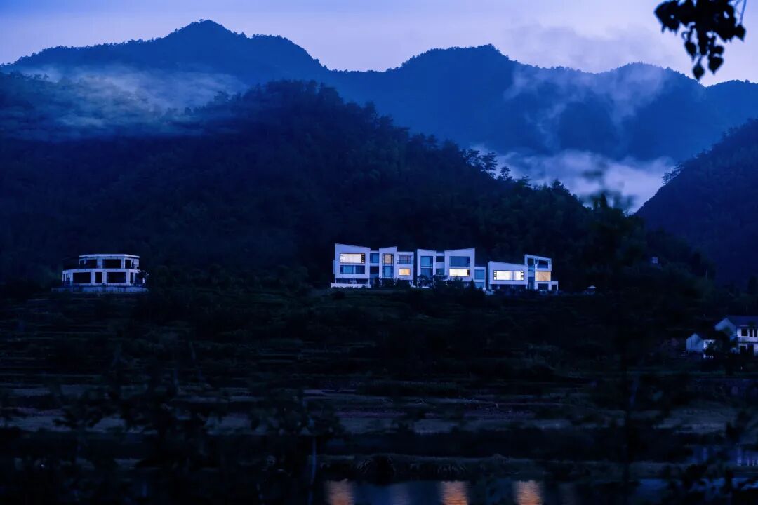 建筑落在山上,面前先是层层跌落的农田,再一湾碧绿湖水,最后视线停留在重山密林之上。仿如馈赠的天然禀赋与人文风景,造就了一幅山水间桃源的画面。这也决定了建筑、景观与室内设计的初衷与基调。