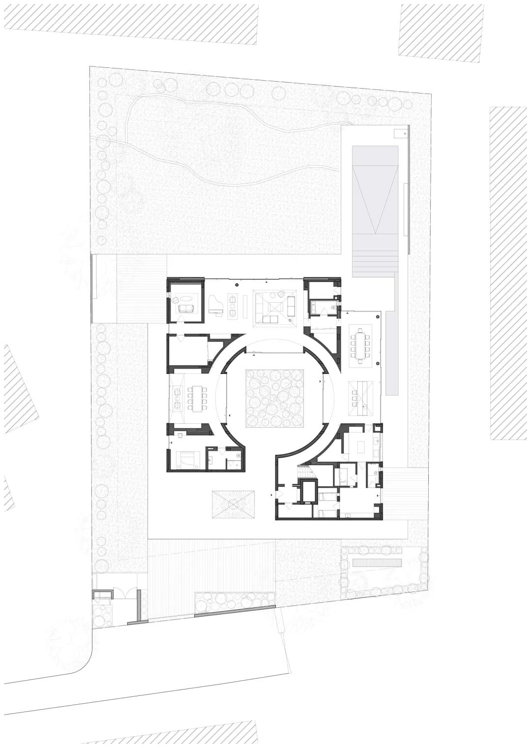 如恩试图通过空间形式的表达来探索共同居住和集体记忆的概念。原址郁郁葱葱的植被沿着缘线形成自然绿化带,这一景致在设计中被保留了下来。