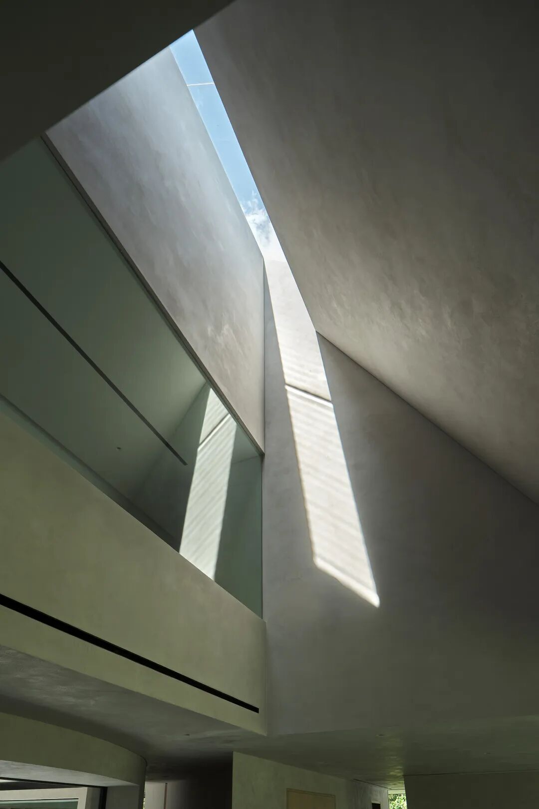 步入纪念花园之前,屋顶上方的一处切空将一棵小树轻轻框入。阳台与采光井从坡屋顶的立面中雕刻而出,光滑的屋顶外部过渡到内部木板纹理的混凝土。