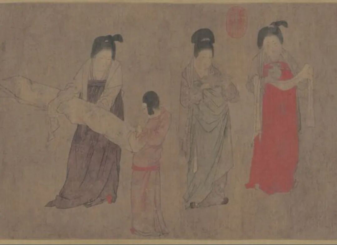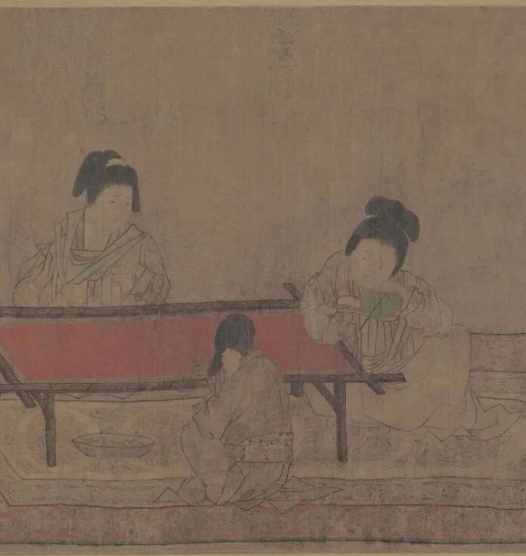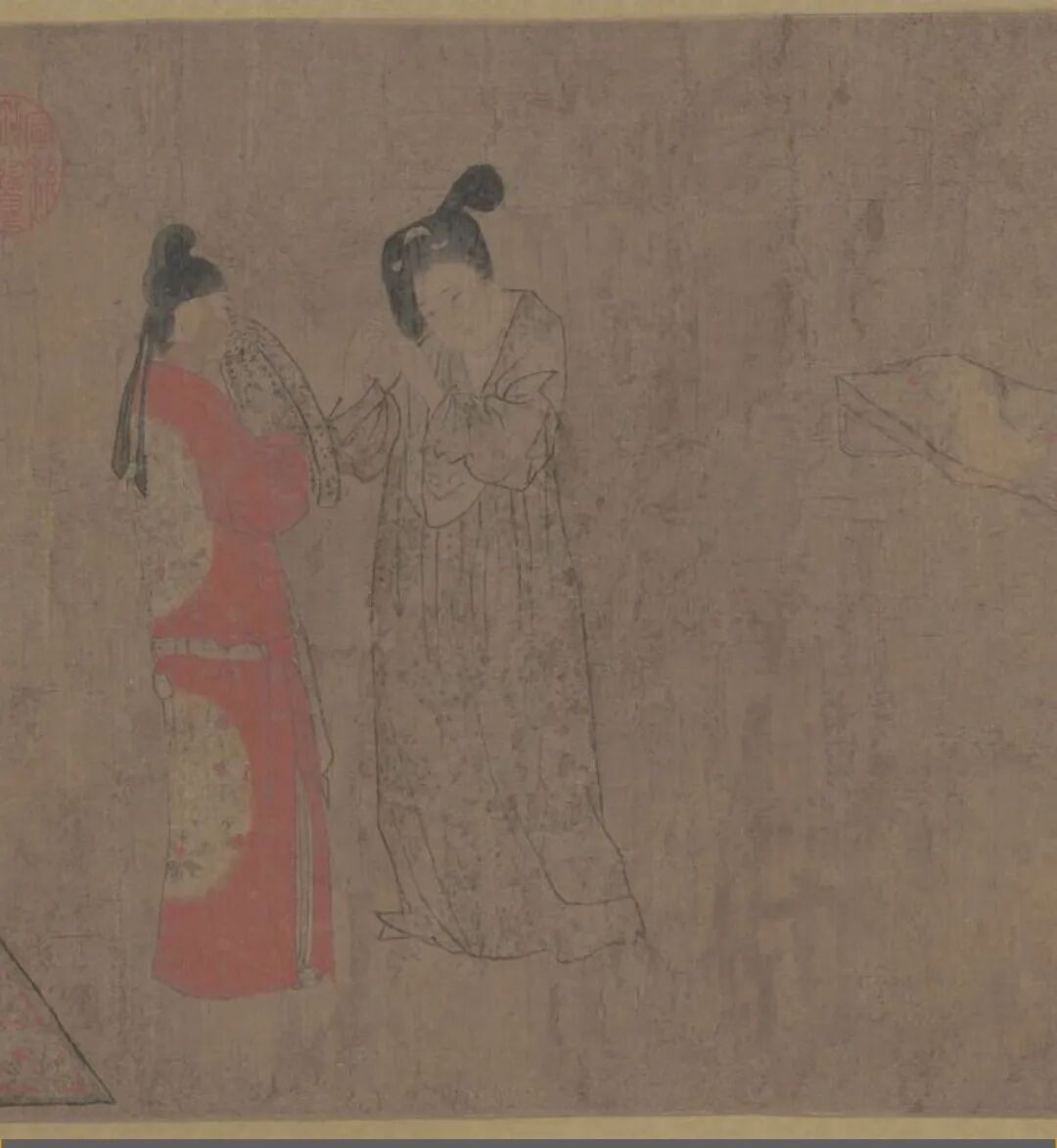 此图描绘了13位头挽高髻、细目圆面、长裙曳地的妃嫔和宫女形象。