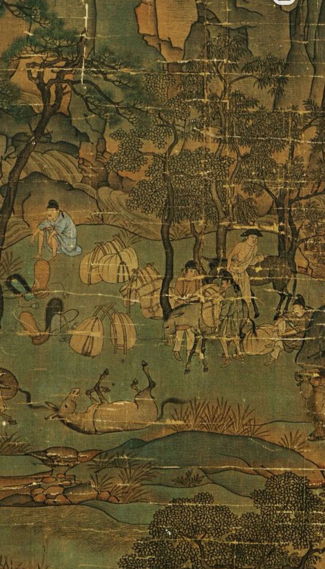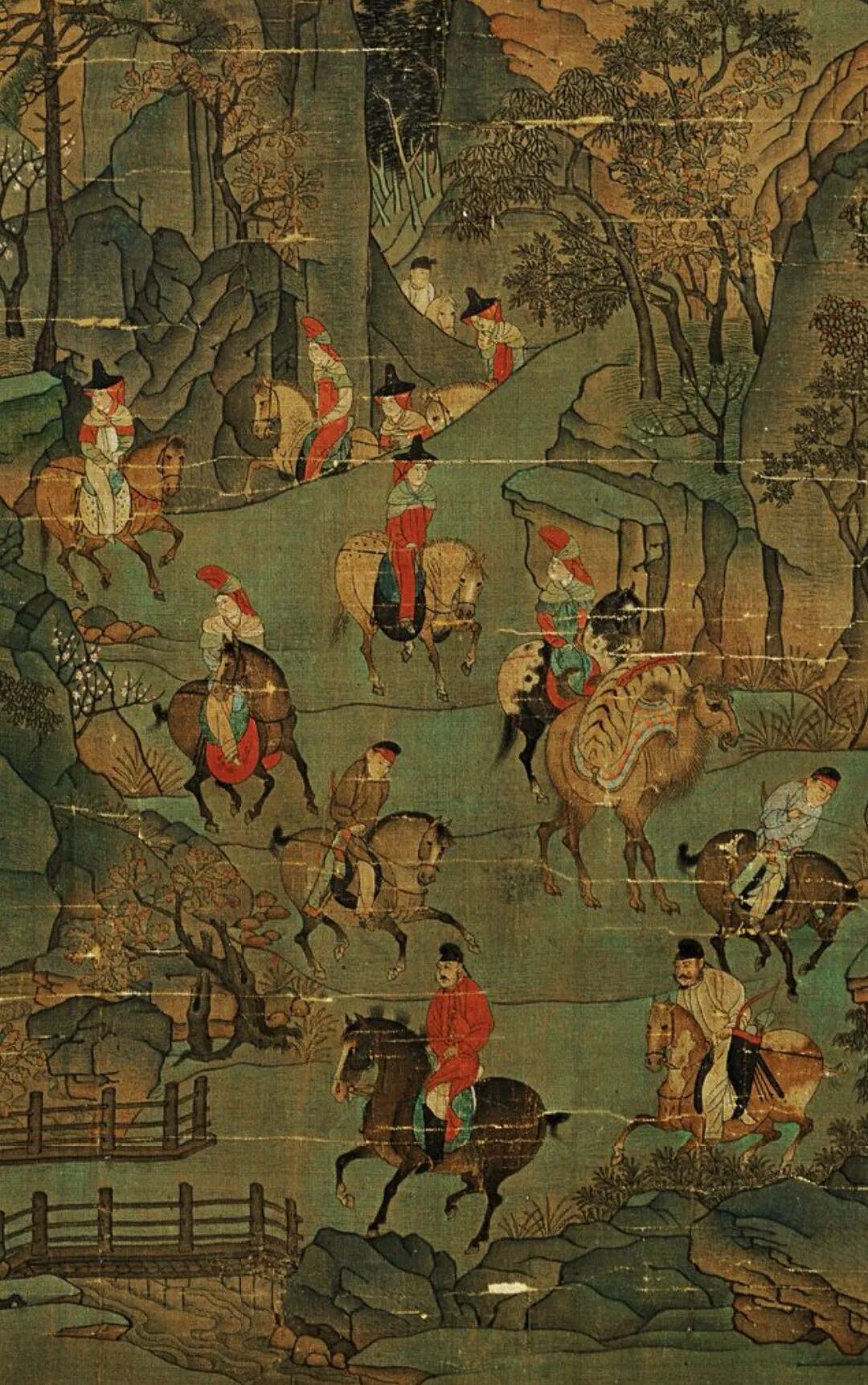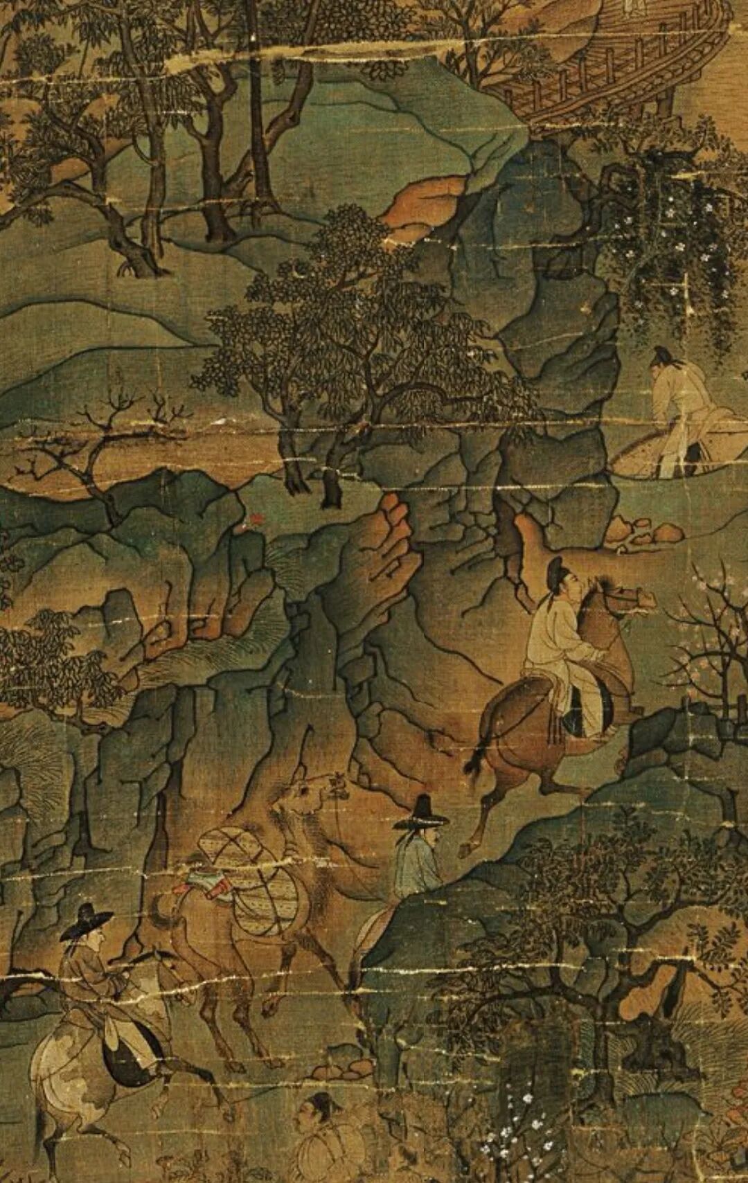 《明皇幸蜀图》描绘的是“安史之乱”爆发后,唐明皇避难蜀地的故事。画中群峰崔嵬峭拔,峰间云气翻卷、古树槎枒,有“连峰去天不盈尺,枯松倒挂倚绝壁”之壮阔气势。画中青绿与墨色的熟练运用,弥补了空勾无皴的不足;巧妙的空间分隔,又赋予了繁密的画面以清晰的节奏感。