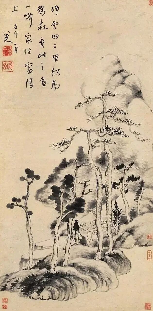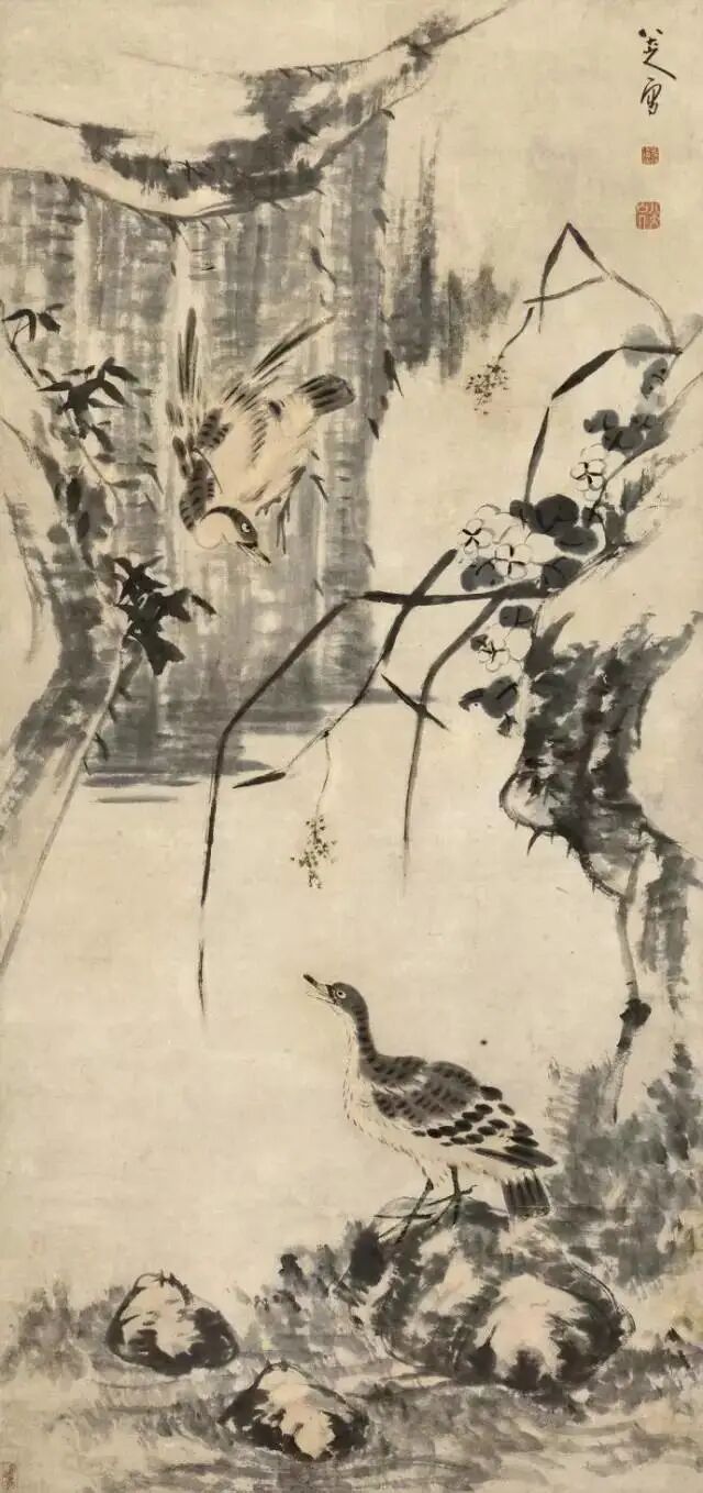 朱耷是明太祖朱元璋第十七子朱权的九世孙,明亡后削发为僧,后改信道教,住南昌青云谱道院。擅书画,早年书法取法黄庭坚。花鸟以水墨写意为主,形象夸张奇特,笔墨凝炼沉毅,风格雄奇隽永;山水师法董其昌,笔致简洁,有静穆之趣,得疏旷之韵。擅书法,能诗文,用墨极少。