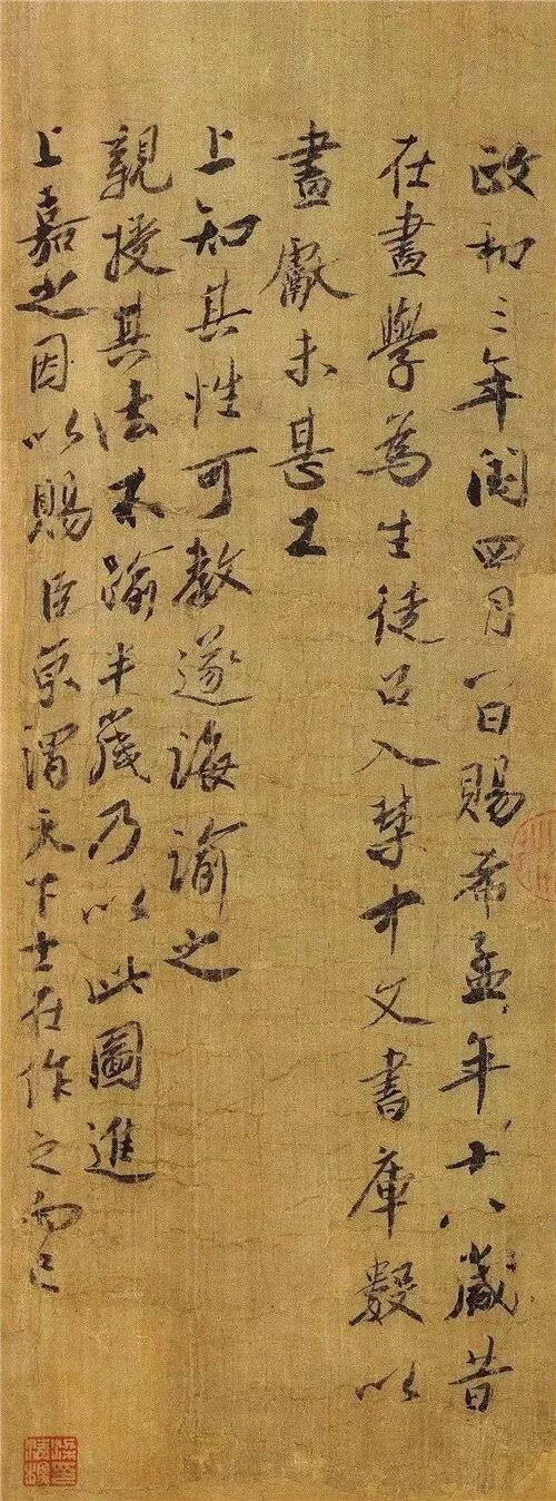 《千里江山图》本身无款,据后隔水上蔡京题字,可知王希孟是画院学生,年十八岁,经过徽宗赵佶指点,有了进步,用不到一年时间画成此画,赵佶很赞赏,把它赐给蔡京。蔡京题于政和三年(1113年)则此图当在此年画成,是有确切的作者和作者年代,并且画得极出色的作品,在中国工笔绘画史上占有一定的地位。