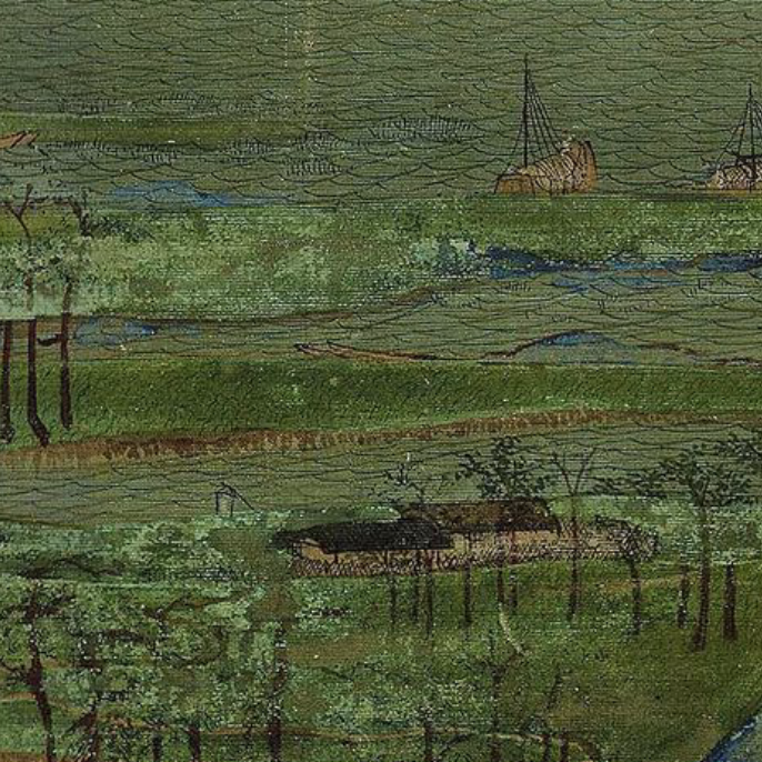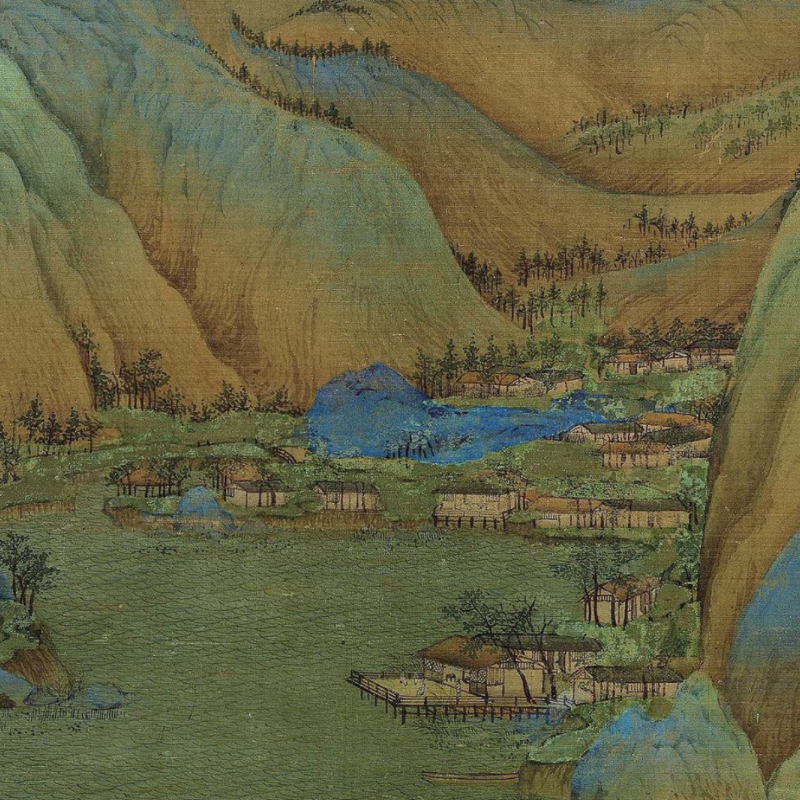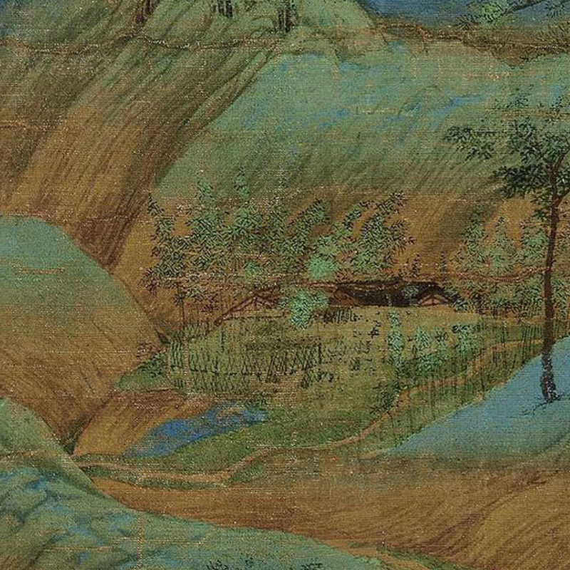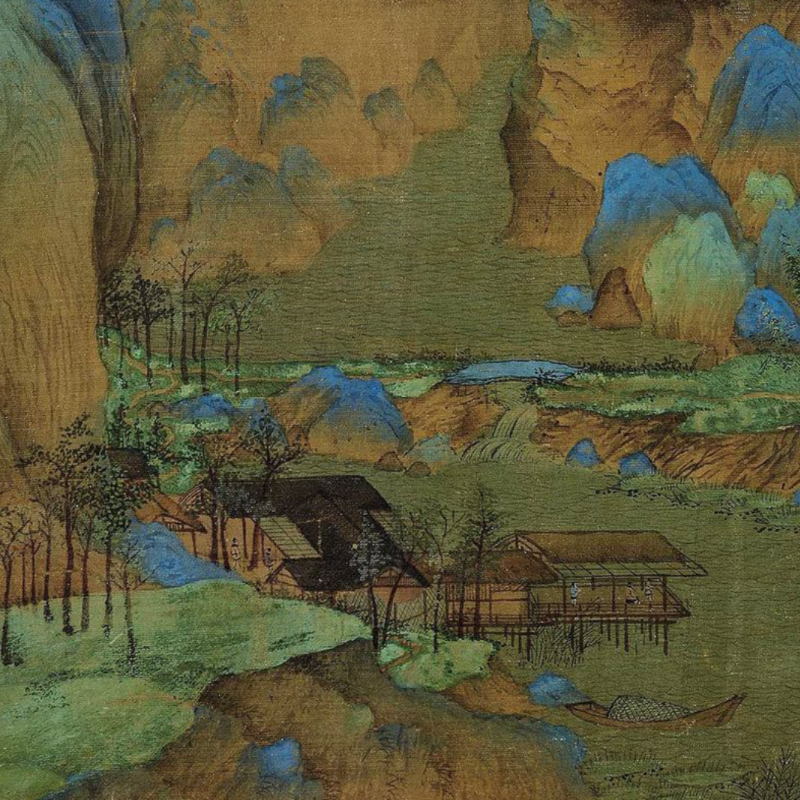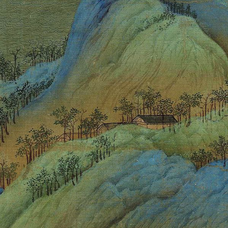 故宫博物院藏北宋王希孟《千里江山图》是北宋末画院山水画中的精品。原画绢本,重青绿设色,画崇山峻岭、江天浩渺之景,其中点缀以屋宇寺观、桥梁舟船、气势雄壮开阔,一气呵成,笔墨工致,傅色艳丽,反映了宋代青绿工笔山水画的最高水平。