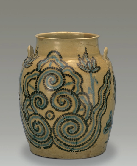 ▲唐 长沙窑青釉褐蓝彩双系罐