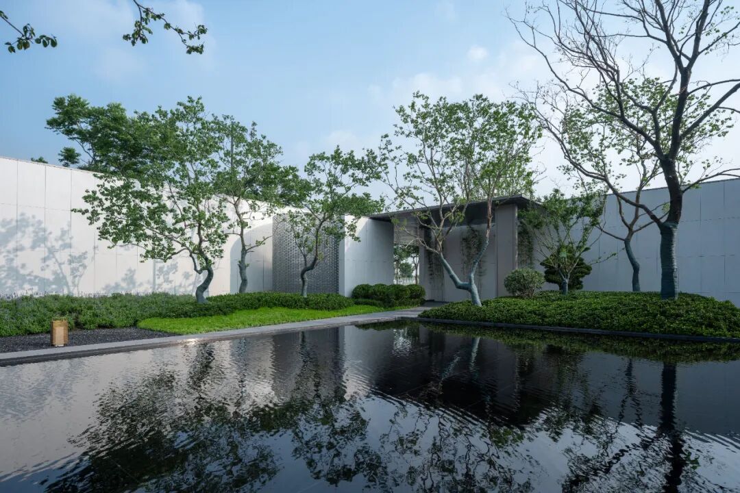 设计团队用现代演绎手法将南古典园林中的核心元素——亭廊、林荫、水面,融入本案的核心景观区中。作为场地南北轴的中点与其它宅间花园的交汇处,设计师期望营造出一个水屿林下的社区会客厅,为在都市繁忙中奔波的人们留一处心之归所。