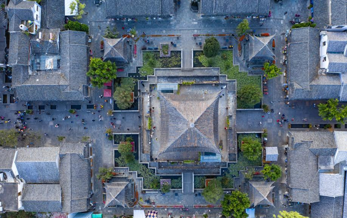 喜洲位于大理古城以北18公里处,东临洱海,西枕苍山,是重要的白族聚居的城镇,这里有着保存最多、最好的白族民居建筑群。从布局上看是典型的“三坊一照壁”及“四合五天井”的白族庭院格局。这些民居雕梁画栋、斗拱重叠、翘角飞檐,门楼、照壁、山墙的彩画装饰艺术绚丽多姿,充分体现了白族人民的建筑才华和艺术创造力。