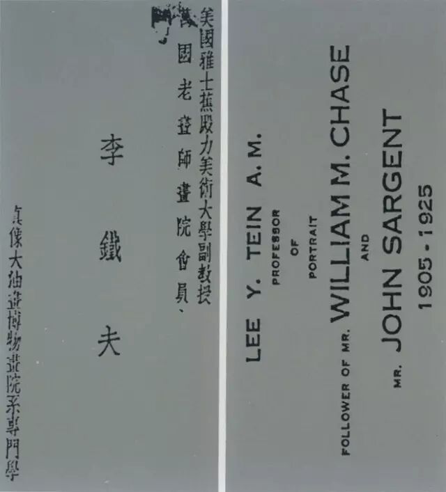 “FOLLOWER OF MR. WILLIAM M.CHASE AND MR.JOHN SARGENT 1905-1925”,在李铁夫英文版名片上,他自称是切斯和萨金特的追随者。1905年是他进入切斯画室后开始跟随切斯学习的时间,而1925年则是萨金特(John Singer Sargent,1856-1925)去世的年份。