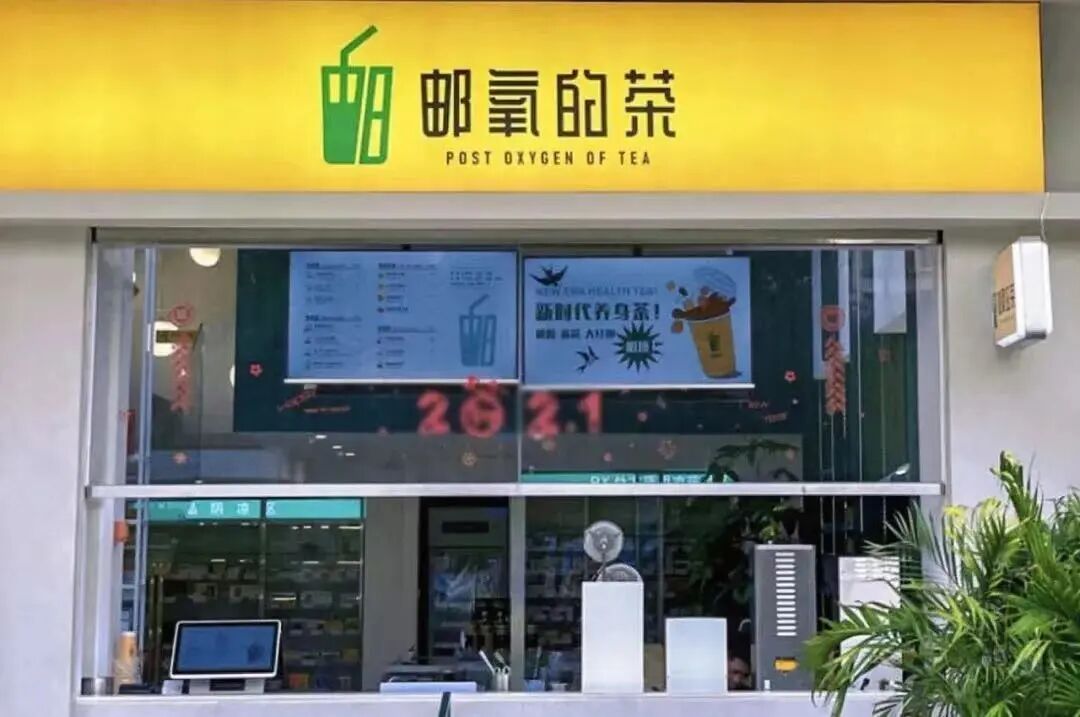 2021年6月,中国邮政在福州开了第一家奶茶店,并用谐音梗取了一个小清新的名字——“邮氧的茶”。Logo设计也很有看头,“邮”字异化成奶茶形状,加上经典的墨绿色和黄色,让人一看就是中国邮政的手笔。