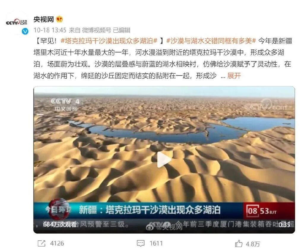#塔克拉玛干沙漠出现了众多湖泊#的新闻上了热搜今年是新疆塔里木河近十年水量最大的一年,河水漫溢到附近的塔克拉玛干沙漠中,这么多湖泊突然出现,场面蔚为壮观。
