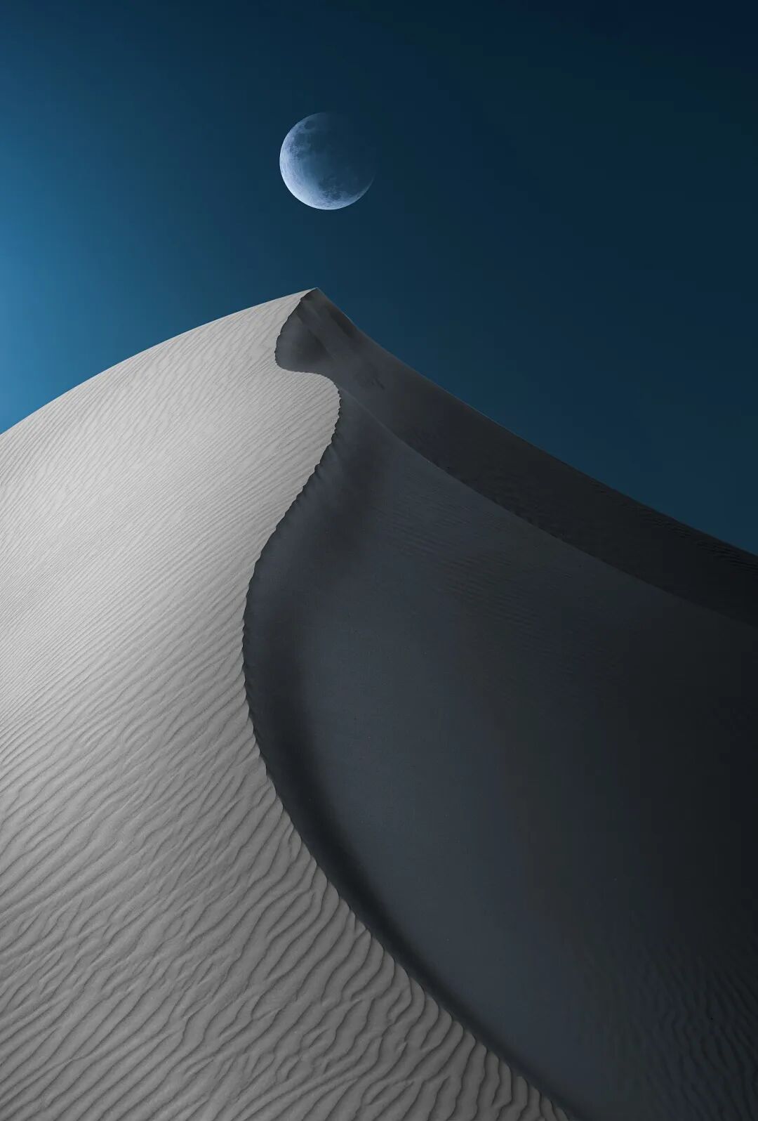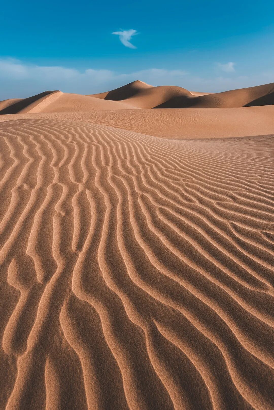 沙漠的层叠感与蔚蓝的湖水相映衬,仿佛给沙漠赋予了灵动性,在湖水的作用下,绵延的沙丘固定而结实的黏附在一起,形成沙漠里奇特而独有景色。