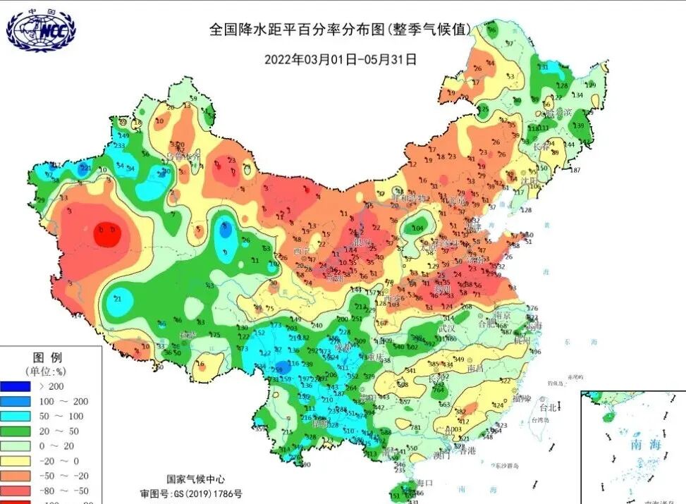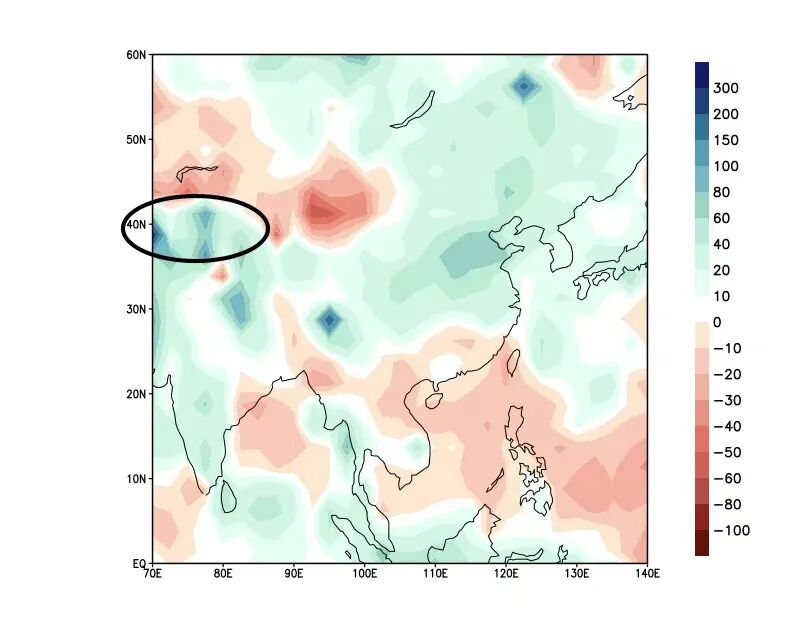 塔克拉玛干附近春夏降水较多,出现了蓝色的区域,为夏季融水提供了有利条件。图\国家气候中心