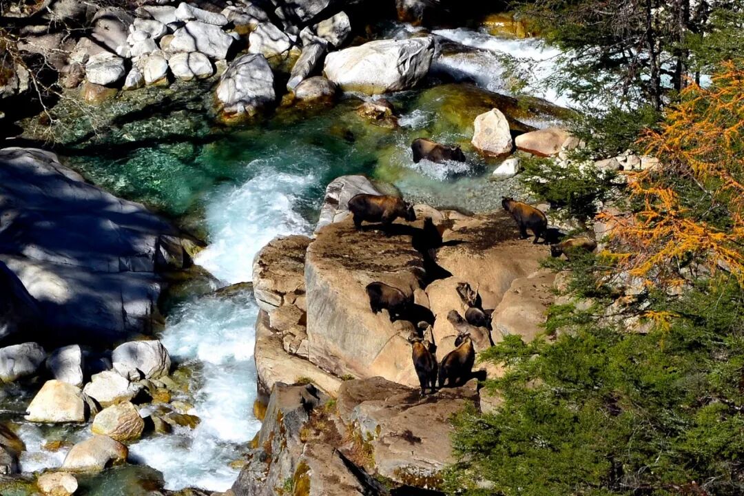 ▲ 高黎贡羚牛,为国家一级保护动物,常几十头聚为一群,在特定时间前往固定硝塘舔取盐分。图/王松/高黎贡山国家级自然保护区怒江管护局