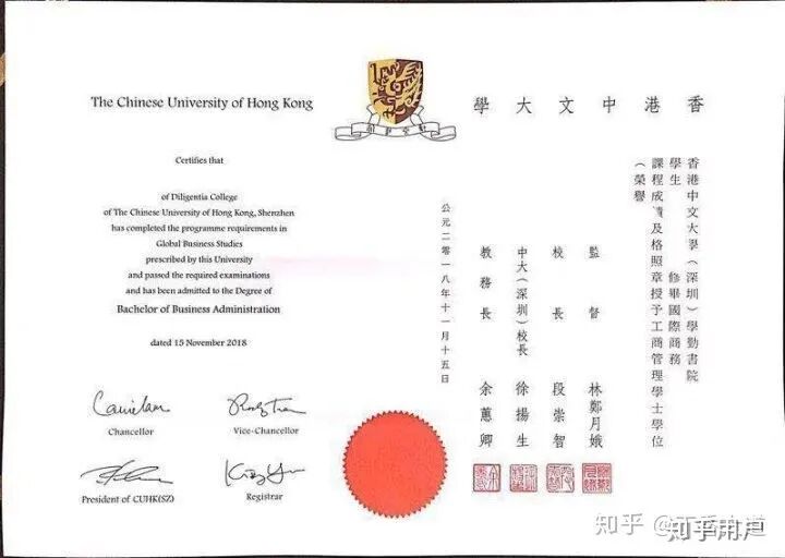 港中深的学位证书与港中文具有同等法律效力。/图源知乎