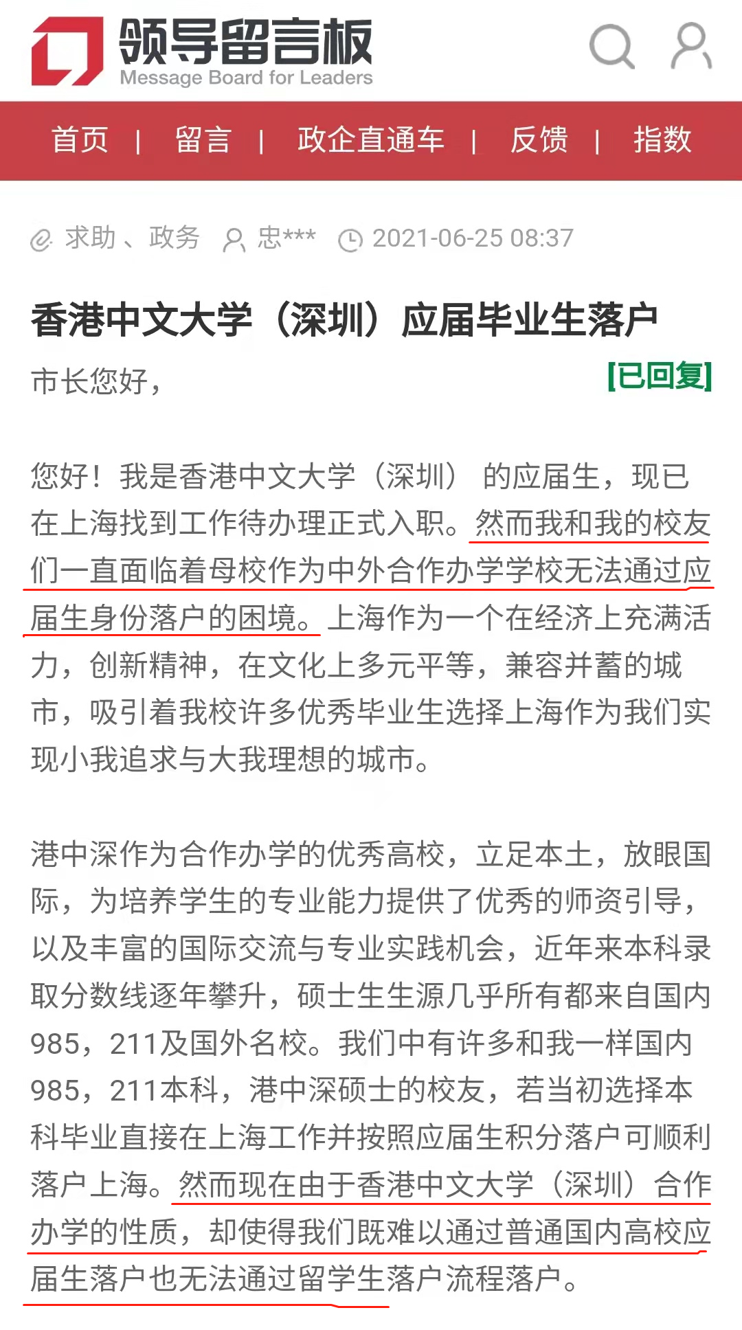 为此,曾有港中深学子跑到人民网领导留言板,反映落户困难的问题——