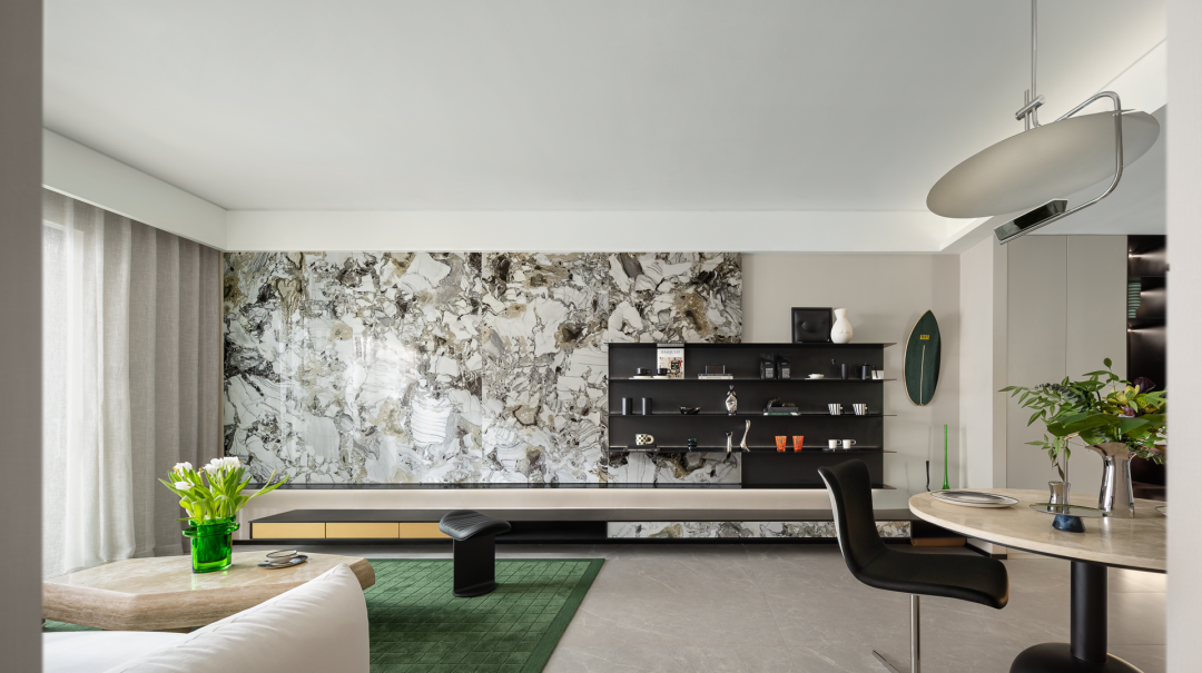 打破了传统客厅空间的设计,以走廊为轴,呈对称陈列,绿色格纹地毯将客厅与餐厅分隔,隔而不阻,形成流动性的无边界空间。