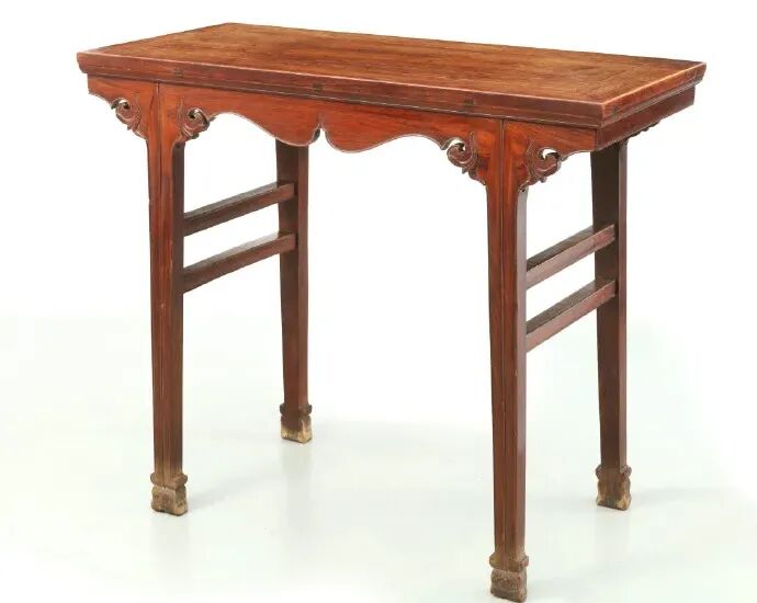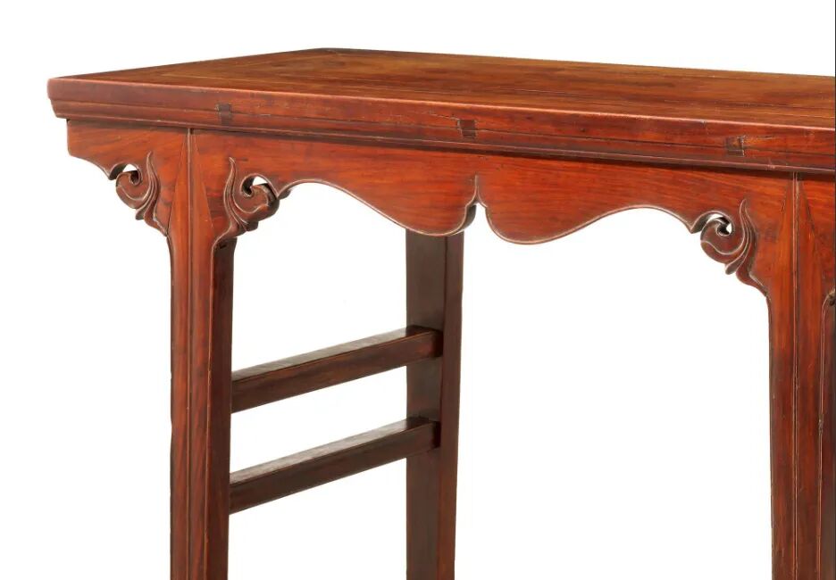 牙板挖壸门,曲线柔和,跌宕起伏,人字形出尖两侧垂下较多,是早期软木家具的风格。