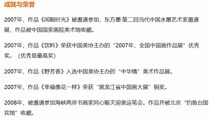 2007年,作品《幸福像花一样》荣获“黑龙江省中国画大展”铜奖。