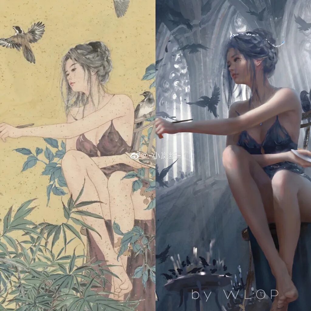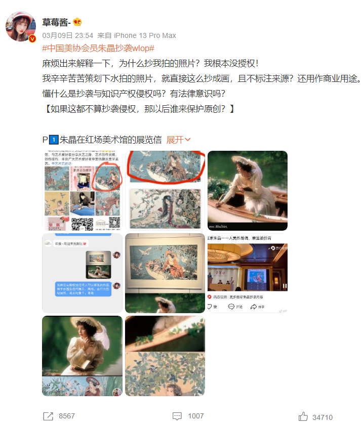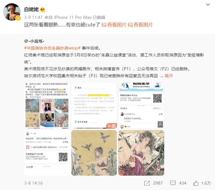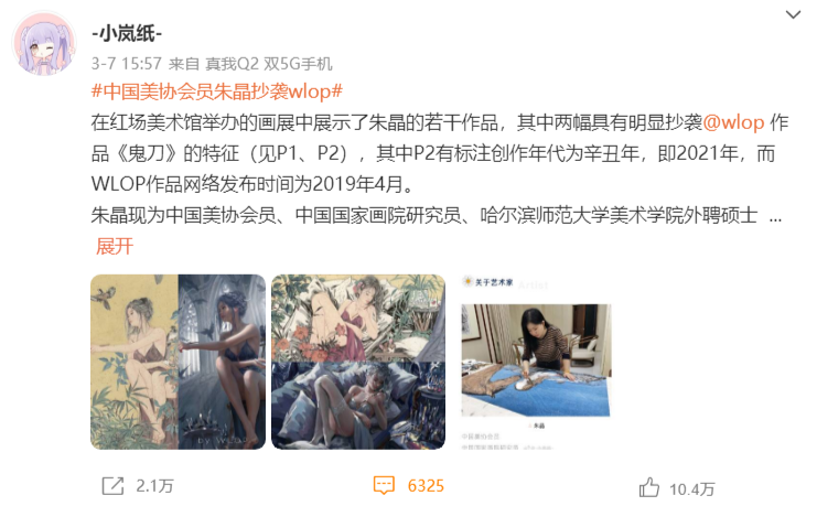 微博网友在哈尔滨红场美术馆举办的画展中观展时,发现了朱晶作者的两幅作品涉嫌抄袭业余动漫师王凌作品。
