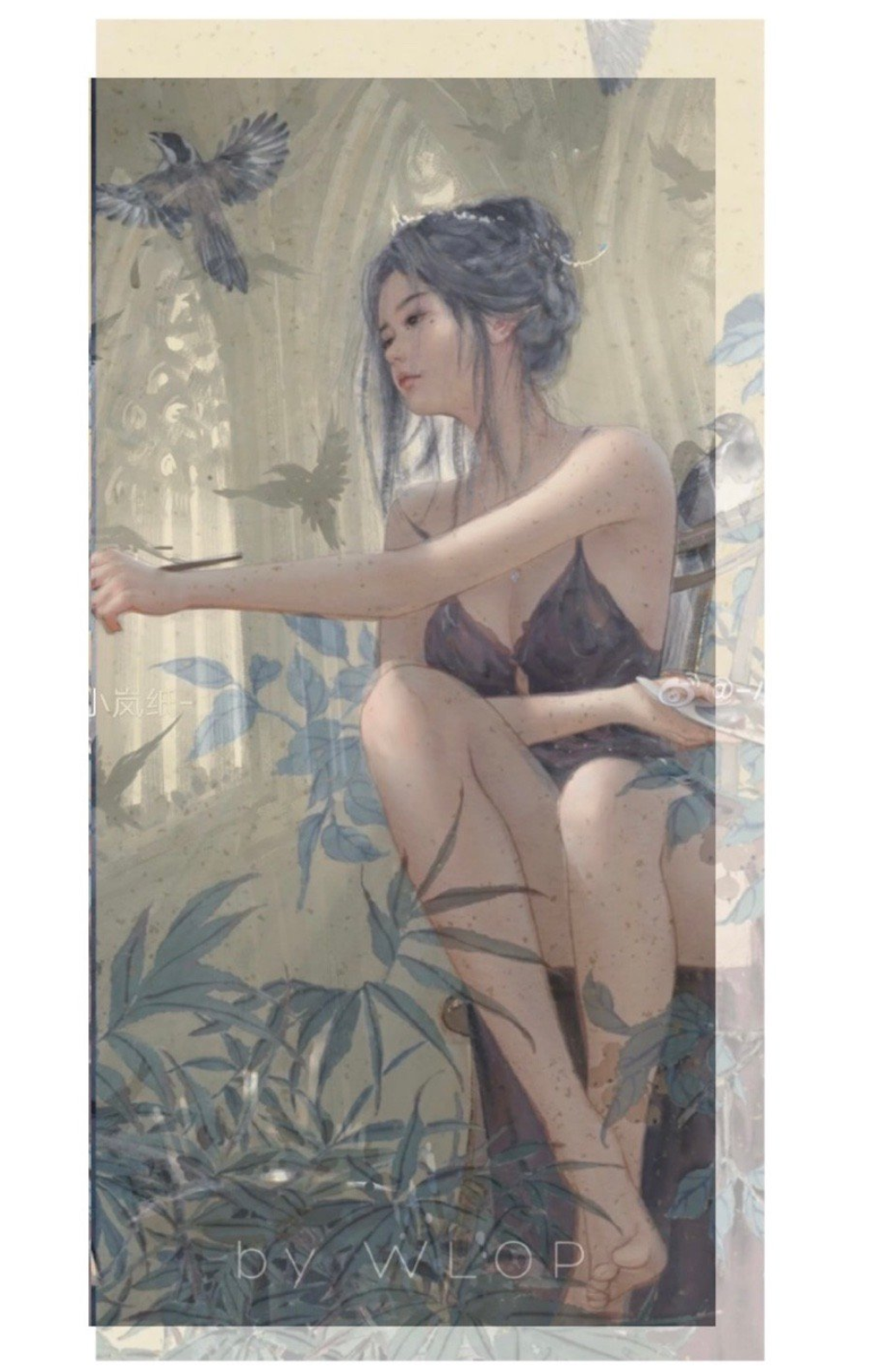 在朱晶的作品中,用线条简单勾勒出一个个穿着打扮都十分入时的年轻女孩或独立或互倚,神态柔美、闲适。传统技巧挥洒在花、叶等植物上,与现代女孩呼应而具反差,这些都已经成为其作品的一种符号。
