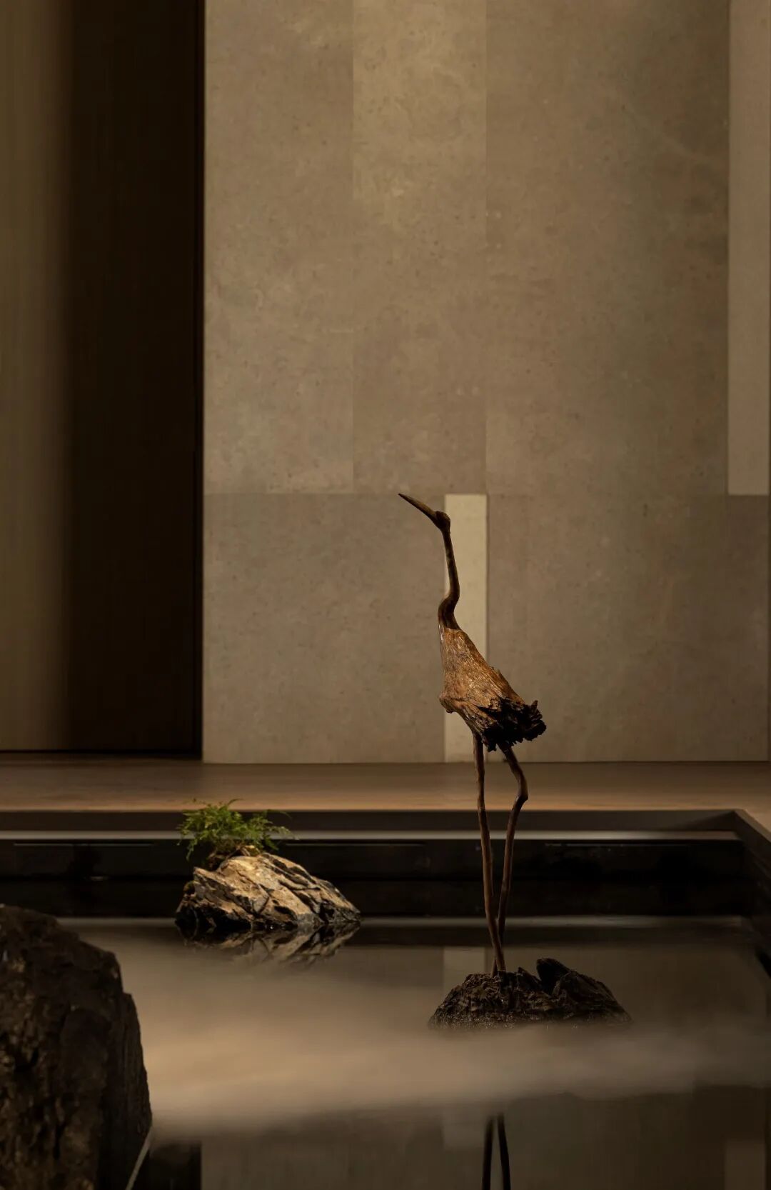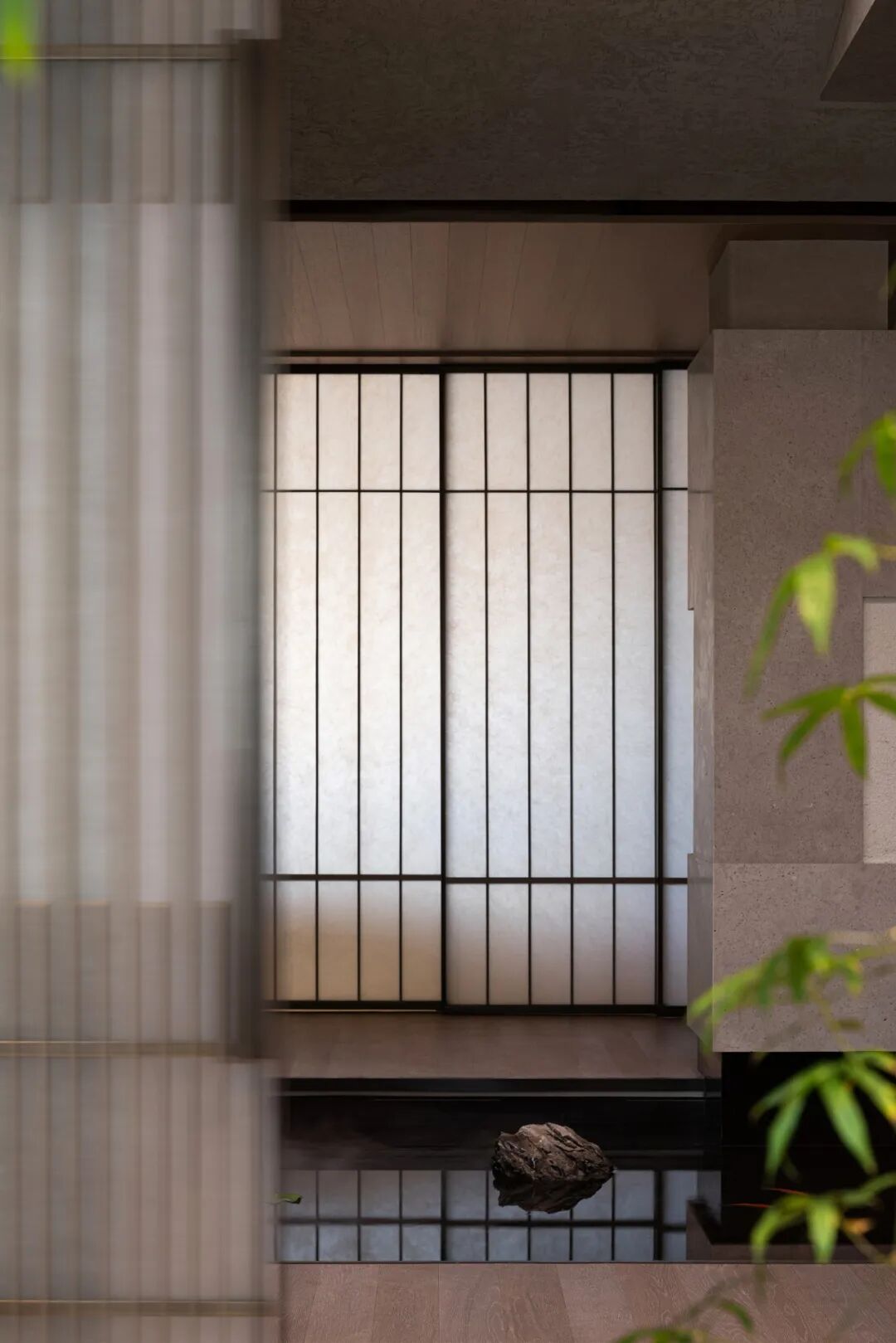 在水庭上方,原始的梁柱结构复杂、凌乱,且与整个空间的意境氛围冲突,因而设计师仅保留横向大梁,对高达6米的层高稍作取舍,通过一个弧面造型模拟屋脊的抽象形态,从而让明晰的结构,服务于隐逸精神的纯创造。