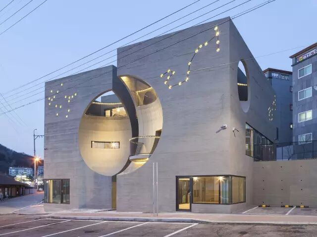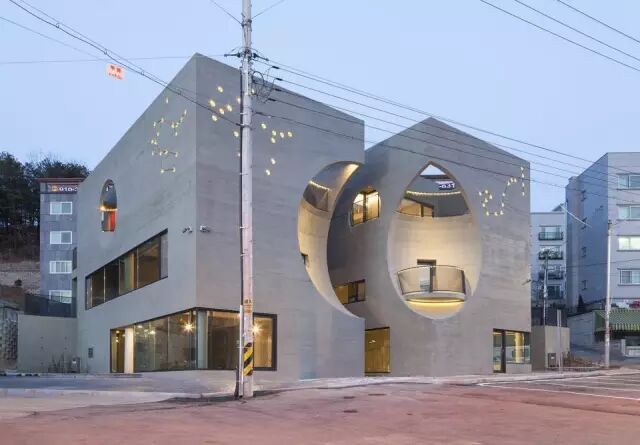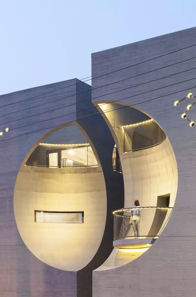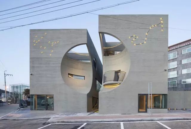 这座受电影情节启发和较低预算限制的建筑静静耸立在路边。两栋单体建筑各有三层,而每一层空间都可通过独立的楼梯进入,被压缩到最小的公共区域解放了空间,更多的面积得以供租户所用。在正立面上,方形体量如同经历了一次球体的撞击,留下了两个大小不一的凹陷。凹陷的空间有如明月,从不同的角度看去或盈或亏,呼应着建筑设计的主题。右侧的凹陷空间内伸出了一个小小的阳台,似乎在诱惑着路人上前一窥。而在左侧的对应位置上,长长的条窗划破表面,内部空间若隐若现。而建筑的内部空间也随着这“凹陷”在不同的高度形成了凸起。三层建筑屋顶的小小凸起如同万神庙的球形拱顶,寻常的方形空间也因此大不相同。建筑的其他侧面上也有着大大小小的圆形开口,阳光透过开口映照在空间内部,建筑的层次也愈显丰富。同时,这些圆形开口也带来了通透感,让在高墙环绕下的顶层花园不至过于压抑。看似随意排布的小圆孔实则是两位住户各自的星座序列。这座似乎毫不起眼的方形建筑在月亮和星星的点缀之下浪漫异常。
