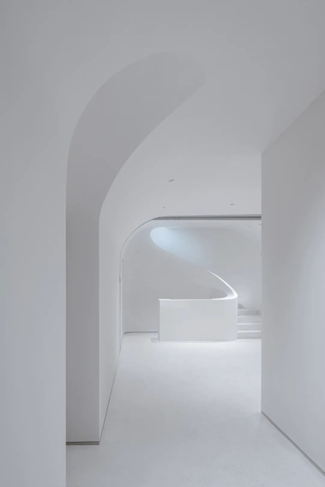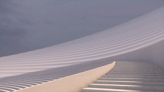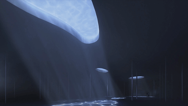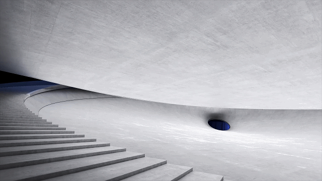设计提取一系列柔和的曲线随空间序列缩放,形成一个内敛的腔体,其基线关系依然延续传统的巴西利卡的形制,而同时具有极强的流动感。而这些曲面在三维层面则形成一个更具未来感甚至永恒感的状态。同时,这种柔美与其外部坚硬的状态形成强烈对比,以形成内外视觉的互动。