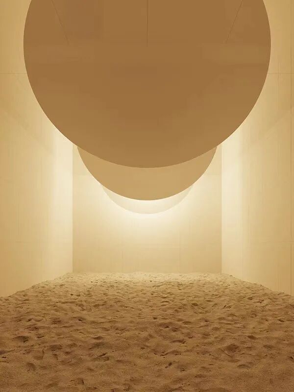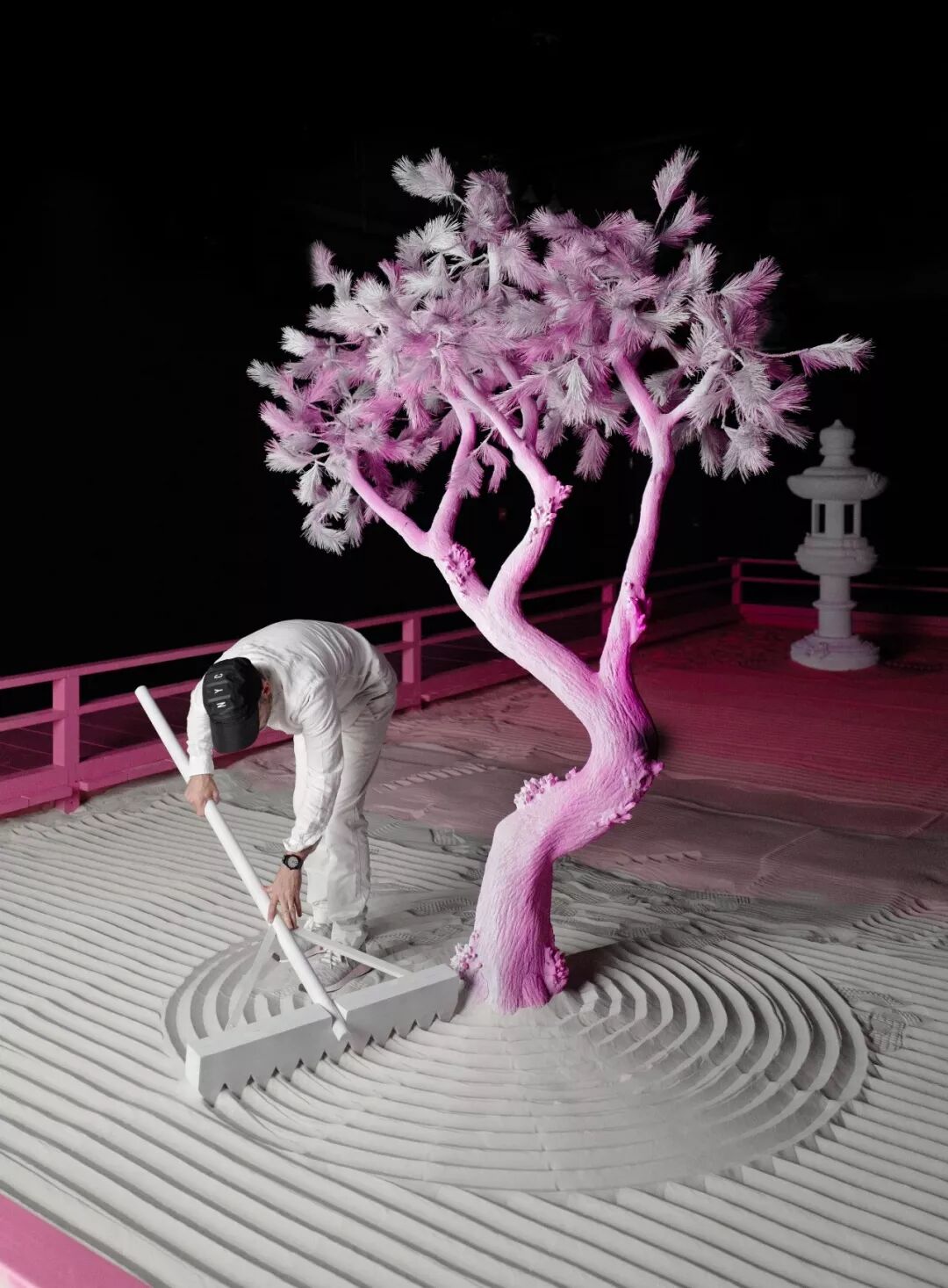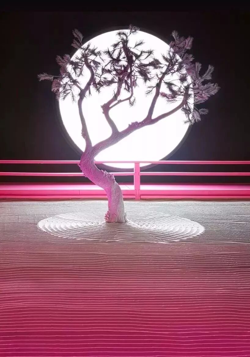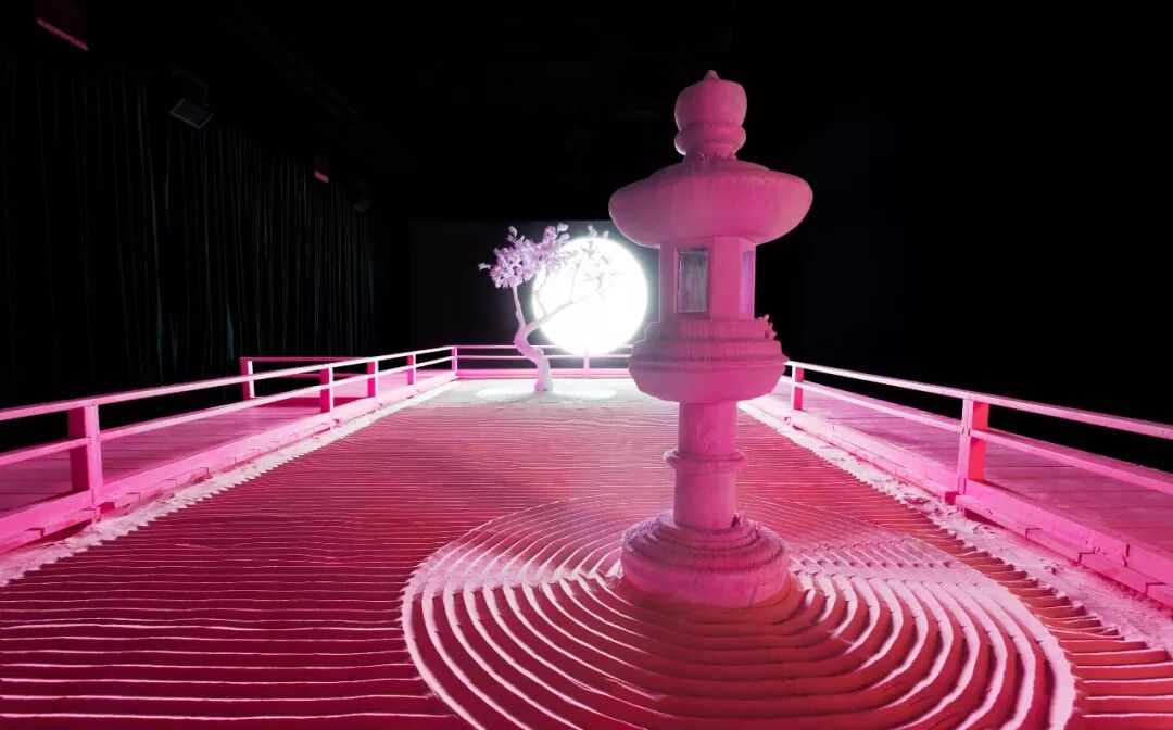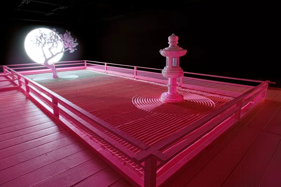 该作品融合了雕塑、灯光和音频元素,创造出一个沉浸式体验,是艺术家对于传统日本枯山水园林景观的重新诠释。在这个沙石园林里,有一棵石化树和一个立着的石灯笼,沐浴在一片明亮的粉色世界里,整个作品里仅有的光源就是一个直径9英尺的球体,看上去就像是月亮一样。